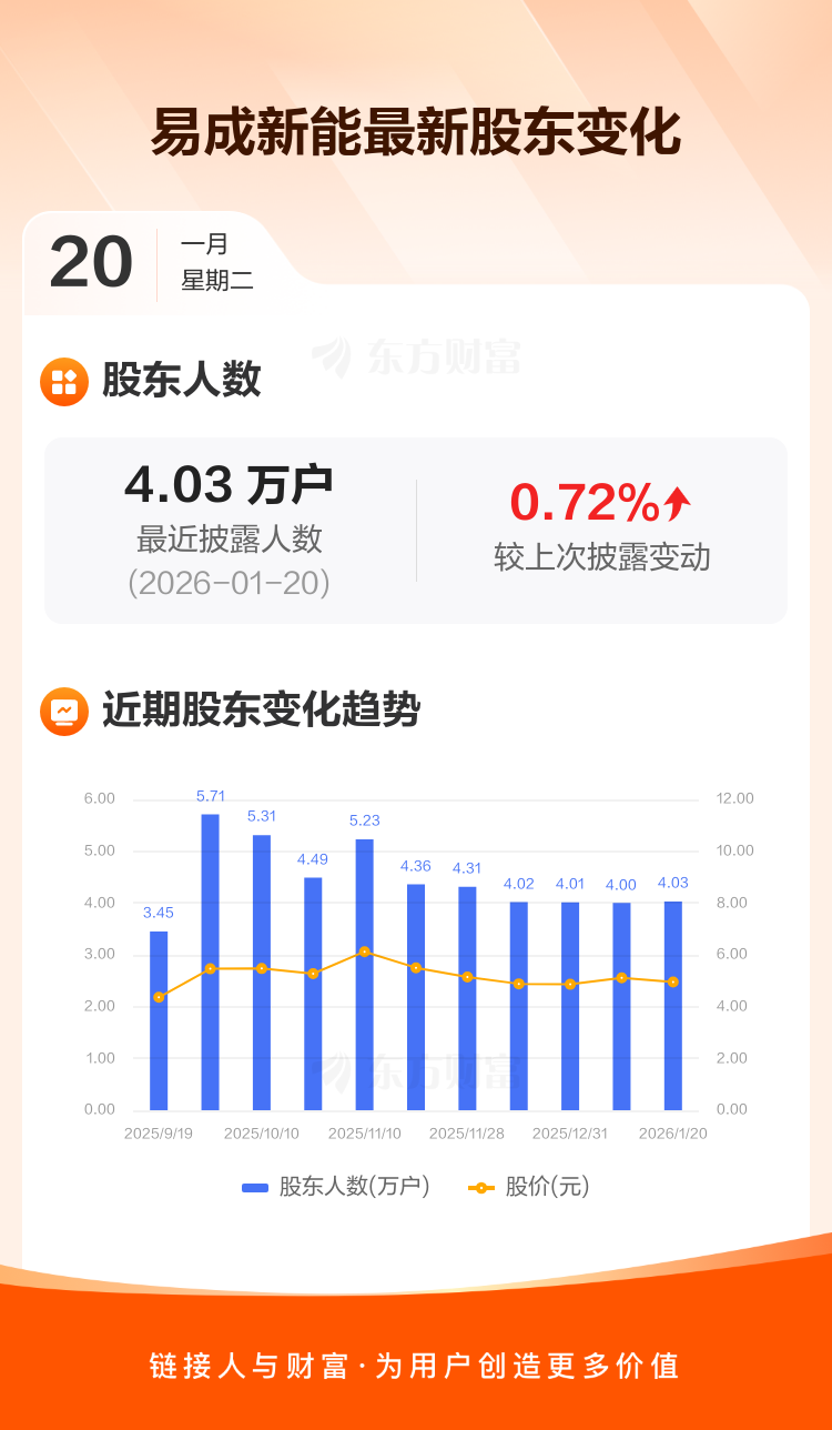 易成新能:截至1月20日最新股东户数4.03万户,较上期增加0.72%