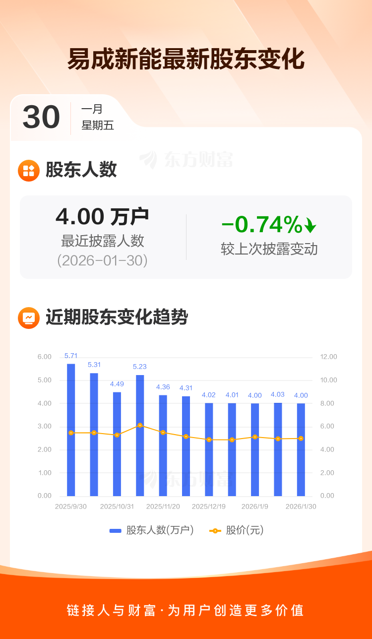 易成新能:截至1月30日最新股东户数4.00万户,较上期减少0.74%