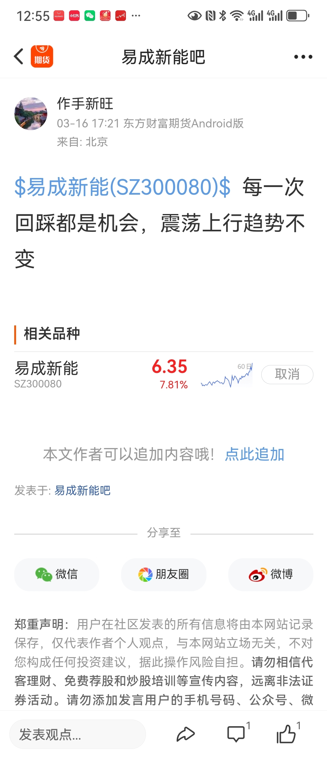 温馨提示: 1.根据《证券法》规定,禁止编造、传播虚假信息或者误导性信息,扰乱证券市场;2.用户在本社区发表的所有资料、言论等仅代表个人观点,与本网站立场无关,不对您构成任何投资建议。用户应基于自己的独立判断,自行决定证券投资并承担相应风险。《东方财富社区管理规定》