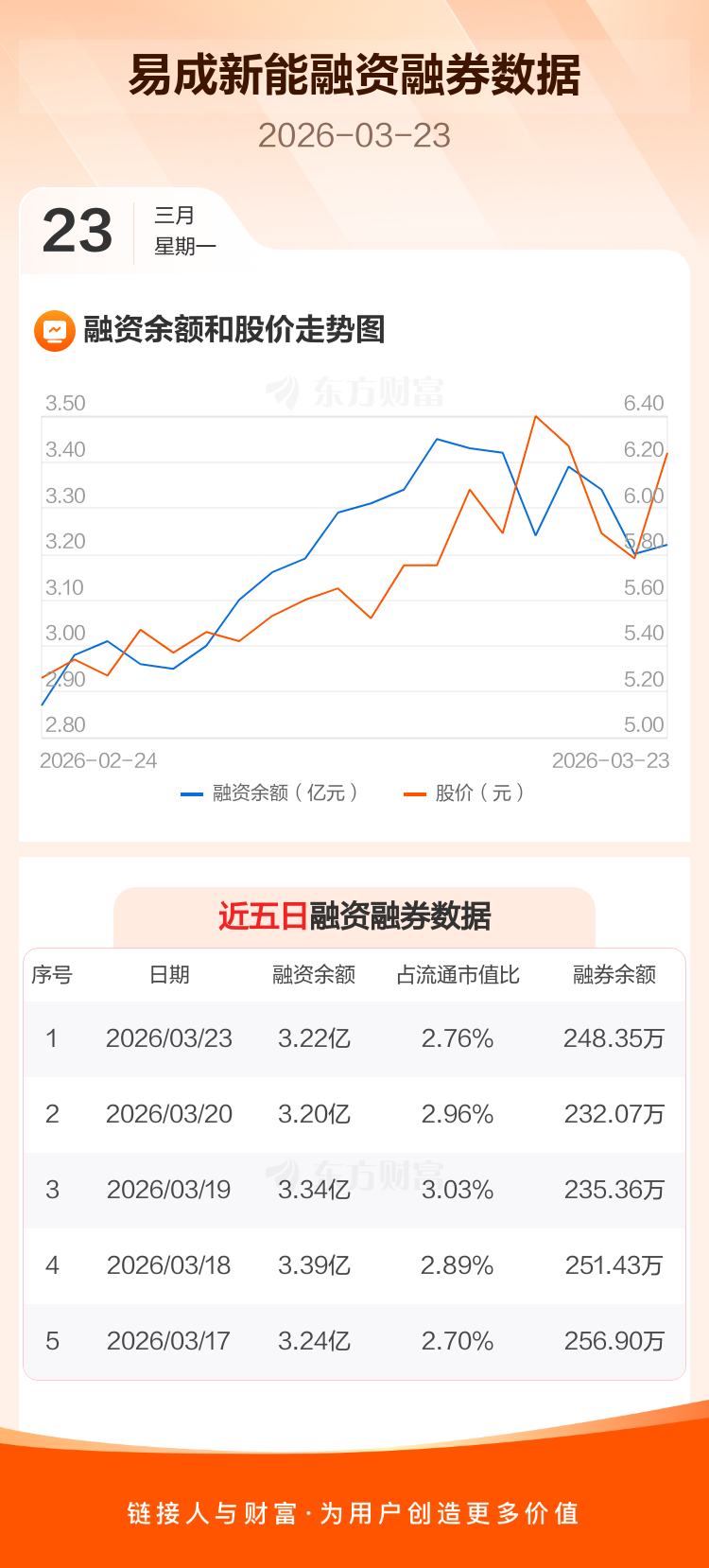 交易所最新数据显示,易成新能于2026年3月23日获融资买入7721.06万元,融资偿还7518.07万元,当日融资净买入202.99万元。目前,该股融资余额3.22亿,占流通市值比例为2.76%。