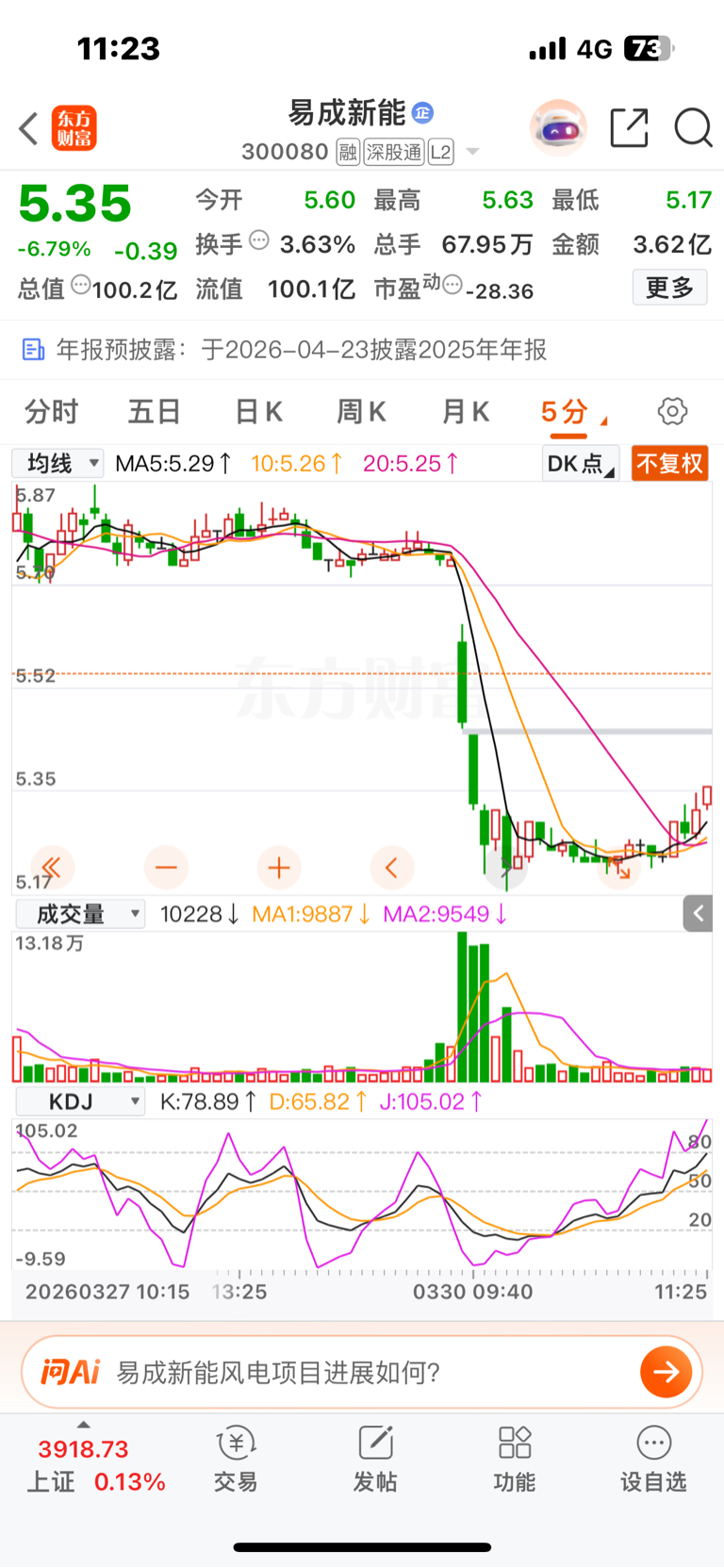 $易成新能(SZ300080)$ 明天抄底有肉,今天抄底活埋,5分钟主力大卖