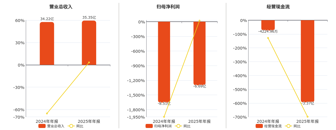 公司营业总收入为35.35亿元。归母净利润为-6.69亿元,较去年同报告期归母净利润增加1.72亿元。经营活动现金净流入为-3.37亿元。