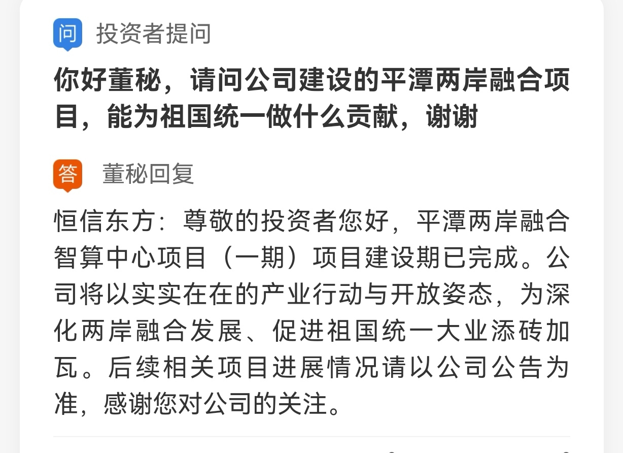 从现在恒信东方发展的趋势讲,建立智算中心、为海峡两岸融合发展统一大业方向是条很不错的提升发展之路,企业需要合作以及注入新的技术领域,并购重组会是一个主题方向,加之近期北京出台并购重组发展意见书以及取消监事会和变更地址都在往这个方向靠拢,不期待有多大表现,只要方向正确,扭亏盈利是迟早的事