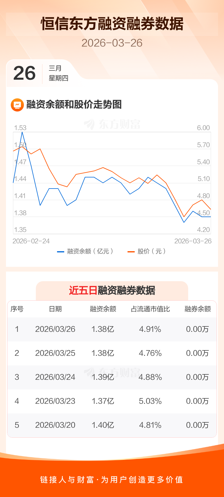 交易所最新数据显示,恒信东方于2026年3月26日获融资买入213.04万元,融资偿还288.92万元,当日融资净偿还75.89万元。目前,该股融资余额1.38亿,占流通市值比例为4.91%。