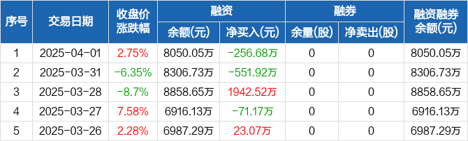 奥克股份:融资净偿还256.68万元,融资余额8050.05万元(04-01)