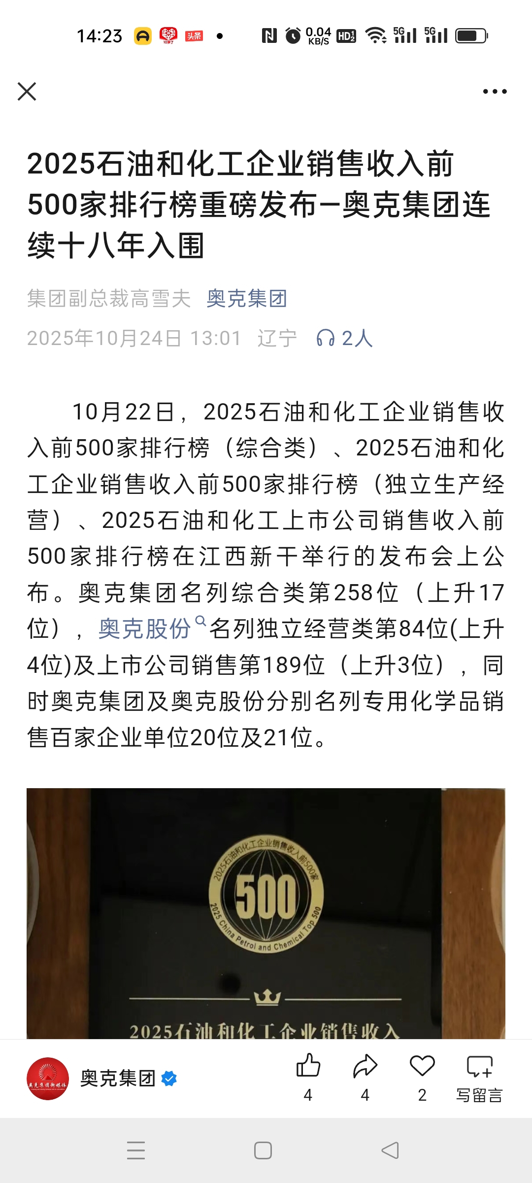 $奥克股份(SZ300082)$ 石油化工500强