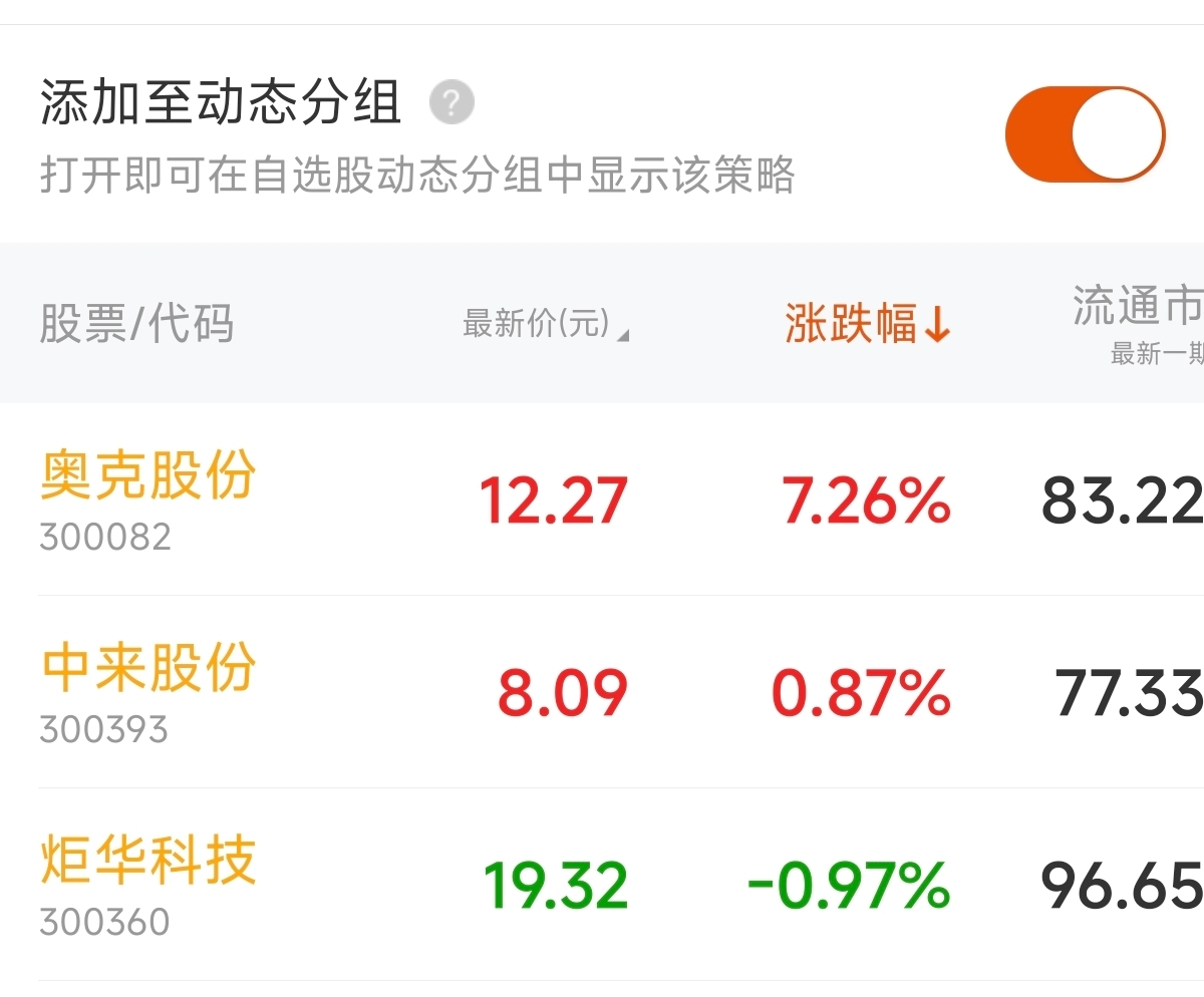 $奥克股份(SZ300082)$ 用我的动态动态分组选股模式,搜到的票就这几个。所以今天上车了奥克股份。一起一起