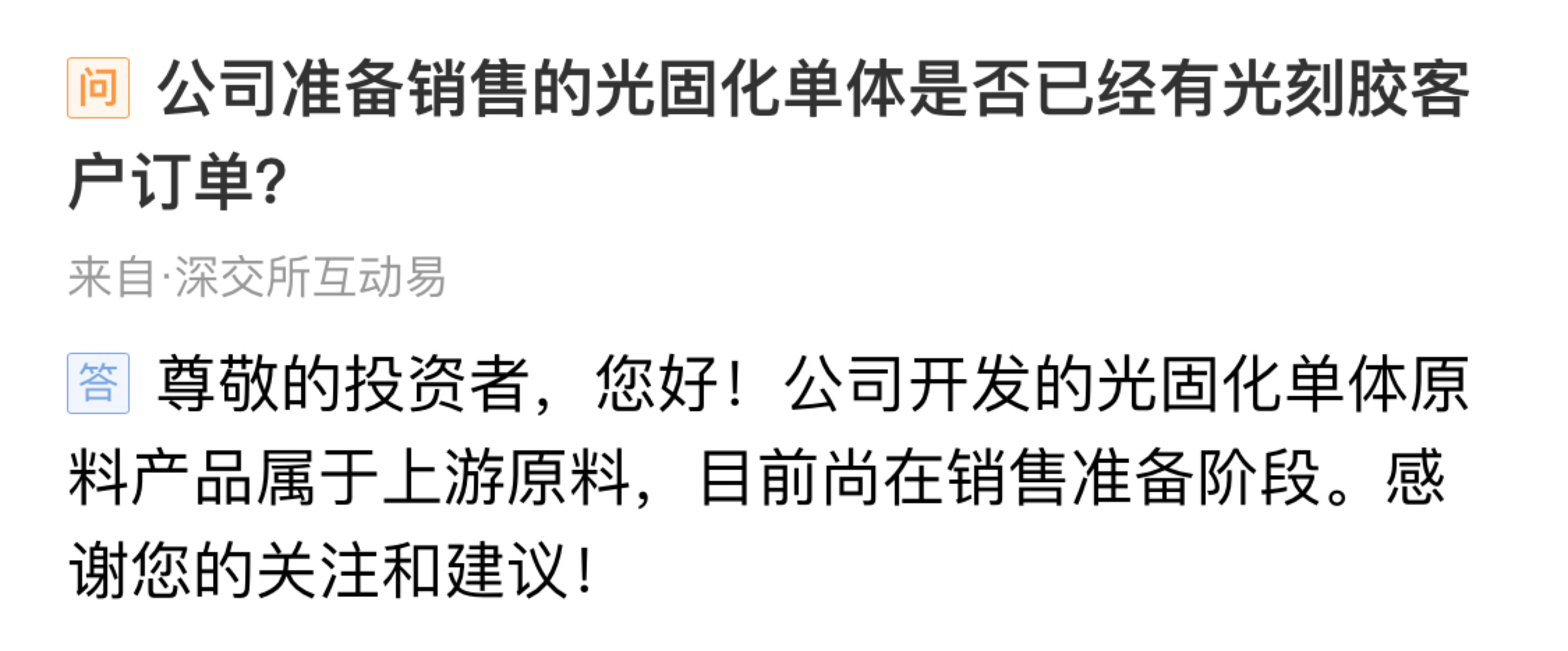 今天这董秘答复很给力啊?第一,准备销售光刻胶原料,第二没有准备增发!