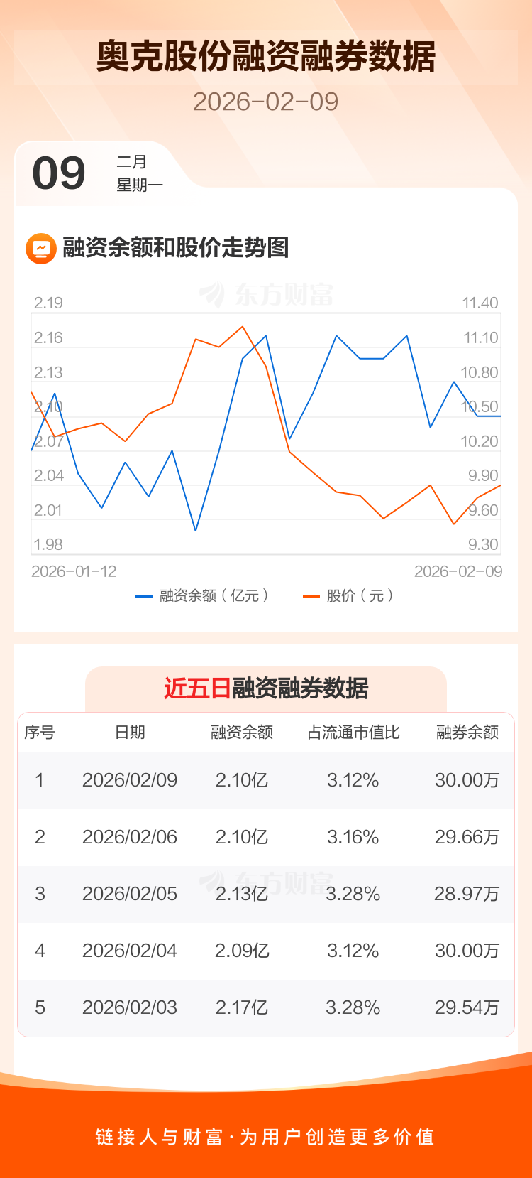 交易所最新数据显示,奥克股份于2026年2月9日获融资买入910.49万元,融资偿还948.33万元,当日融资净偿还37.84万元。目前,该股融资余额2.10亿,占流通市值比例为3.12%。