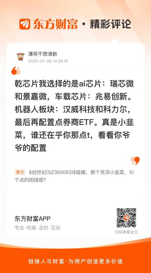 $创世纪(SZ300083)$ 组合继续大涨,深套得小韭菜羡慕吗//@薄荷不想清新 : 乾芯片我选择的是ai芯片:瑞芯微和景嘉微,车载芯片:兆易创新。机器人板块:汉威科技和科力尔,最后再配置点券商ETF。真是小韭菜,谁还在乎你那点t,看看你爷爷的配置