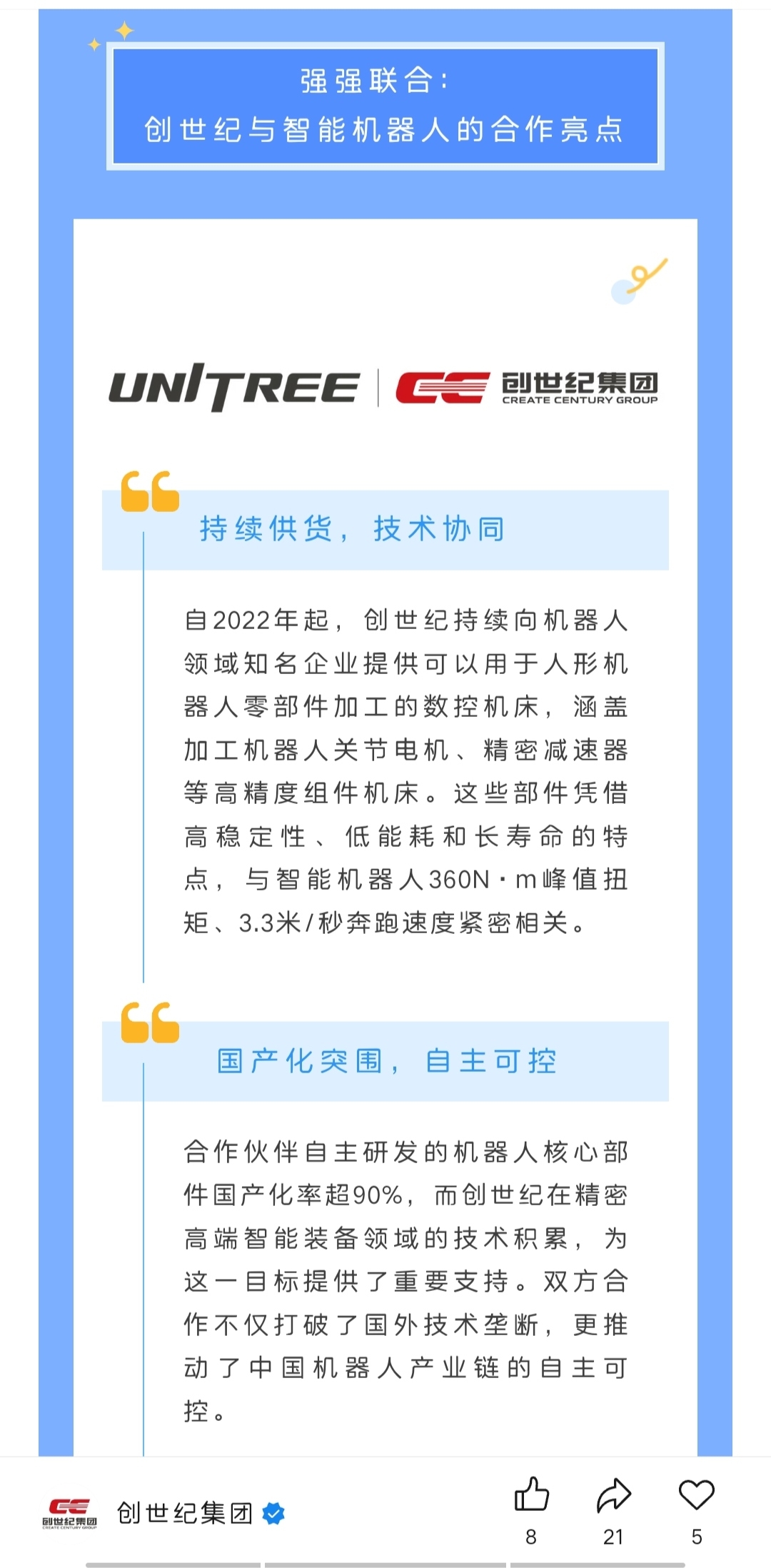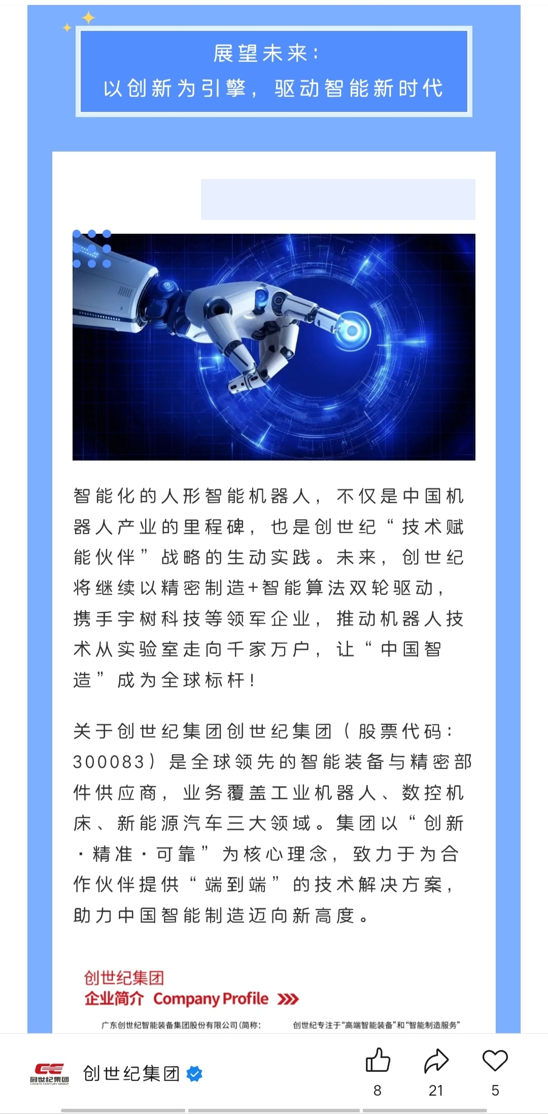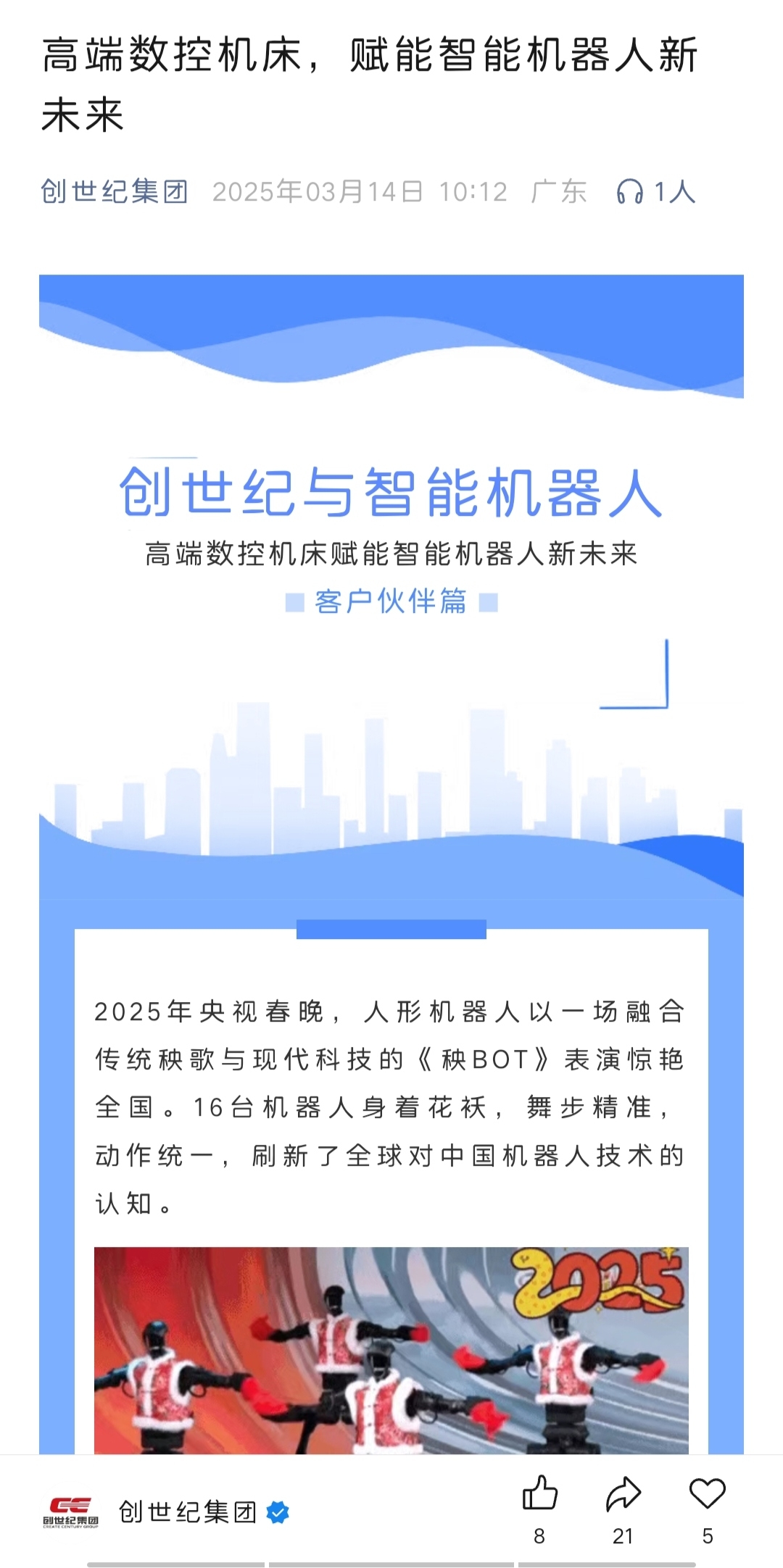 $创世纪(SZ300083)$ 公司还是很有实力的,2025人形机器人量产的话,这些设备都用的上,信息来自创世纪微信公众号。