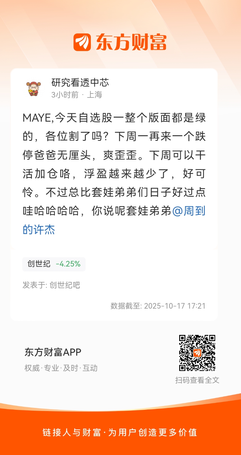MAYE,今天自选股一整个版面都是绿的,各位割了吗?下周一再来一个跌停爸爸无厘头,爽歪歪。下周可以干活加仓咯,浮盈越来越少了,好可怜。不过总比套娃弟弟们日子好过点哇哈哈哈哈,你说呢套娃弟弟@周到的许杰