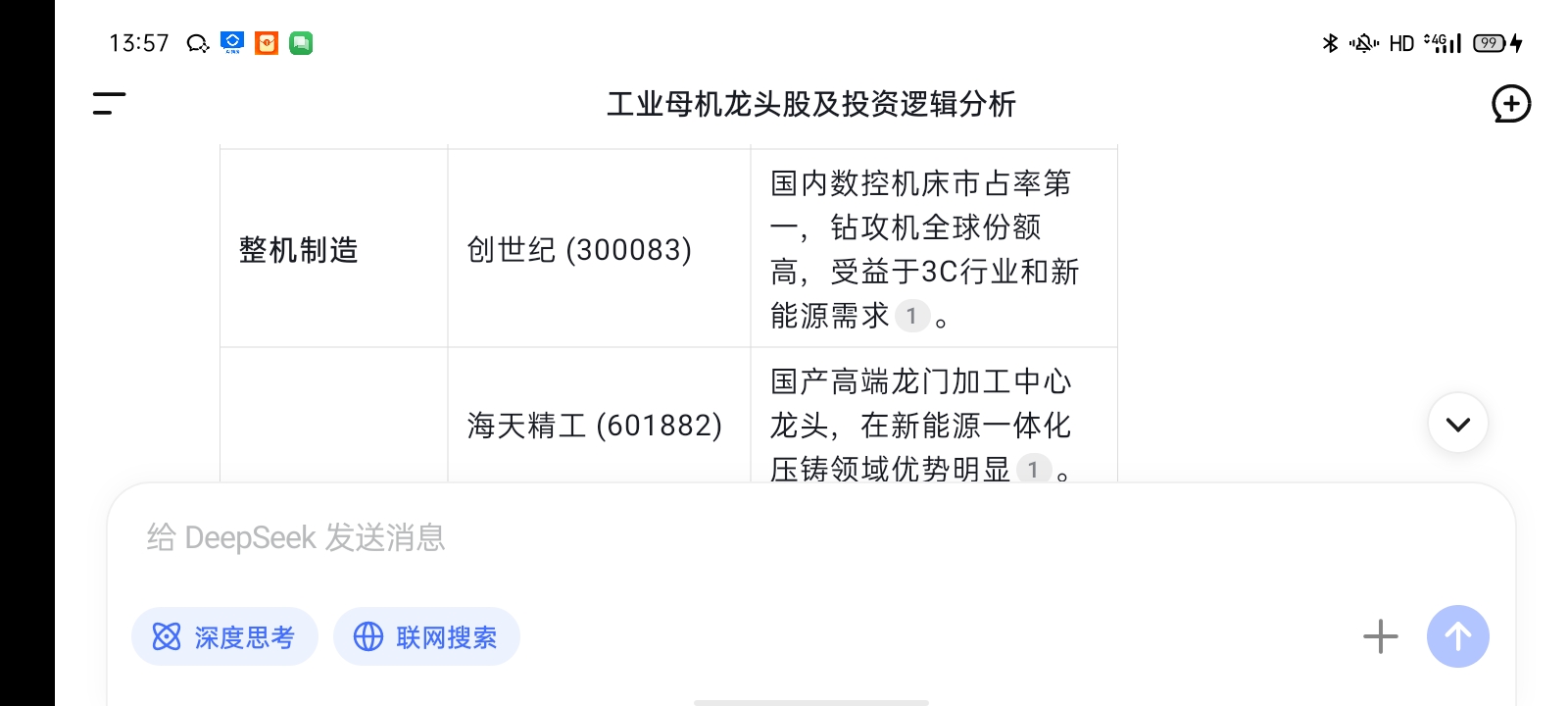 刚才用deepseek查了一下,创世纪是工业母机整机龙头