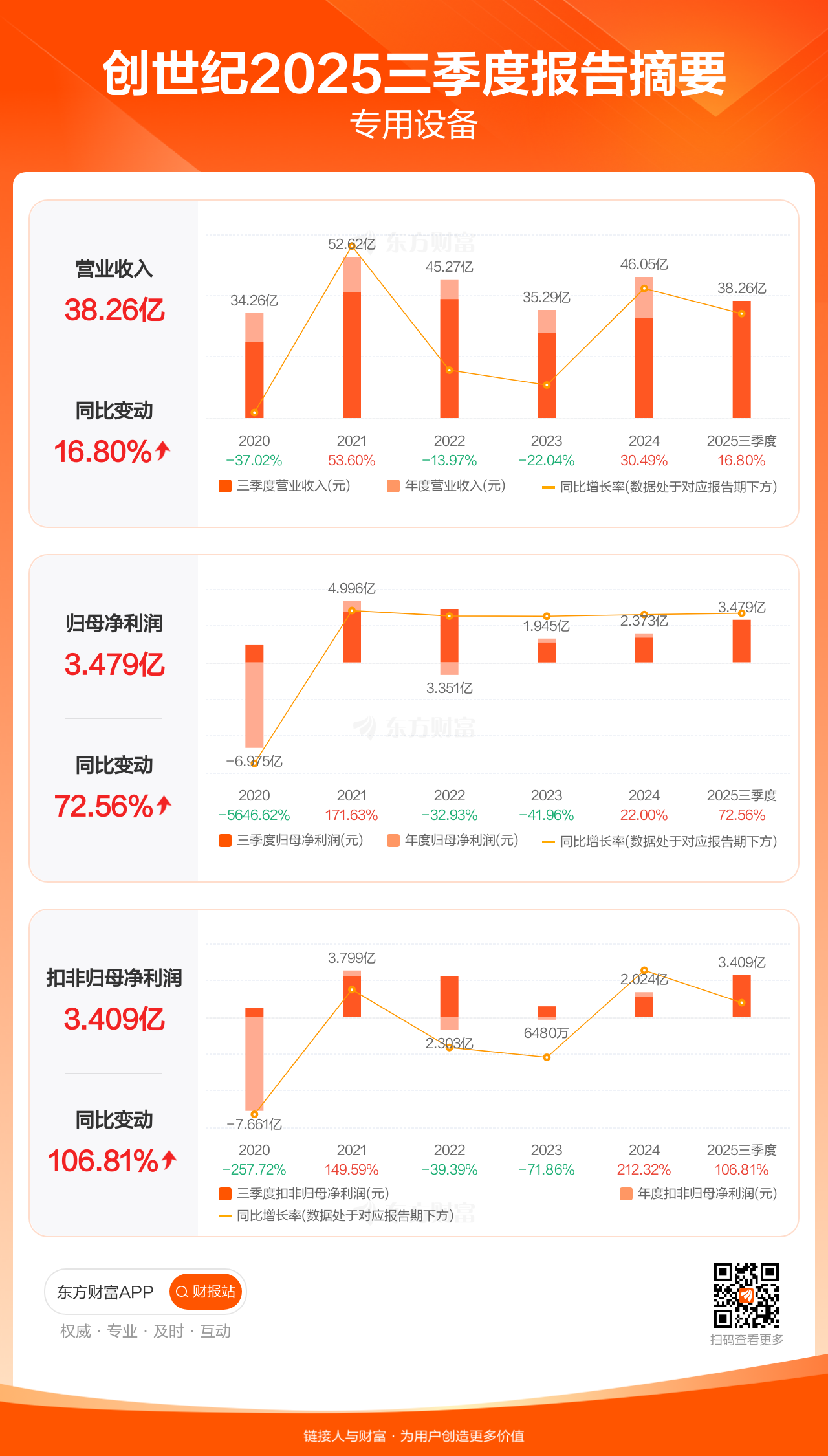 创世纪10月27日发布2025年三季报显示,公司前三季实现营业收入38.26亿元,同比增长16.80%;归母净利润3.48亿元,同比增长72.56%;扣非归母净利润3.41亿元,同比增长106.81%。