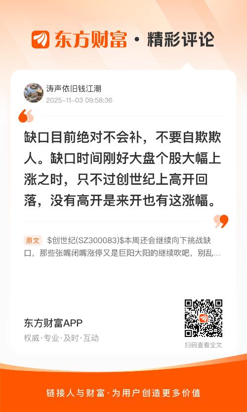 $创世纪(SZ300083)$ 到底是谁自欺欺人啊//@涛声依旧钱江潮 : 缺口目前绝对不会补,不要自欺欺人。缺口时间刚好大盘个股大幅上涨之时,只不过创世纪上高开回落,没有高开是来开也有这涨幅。