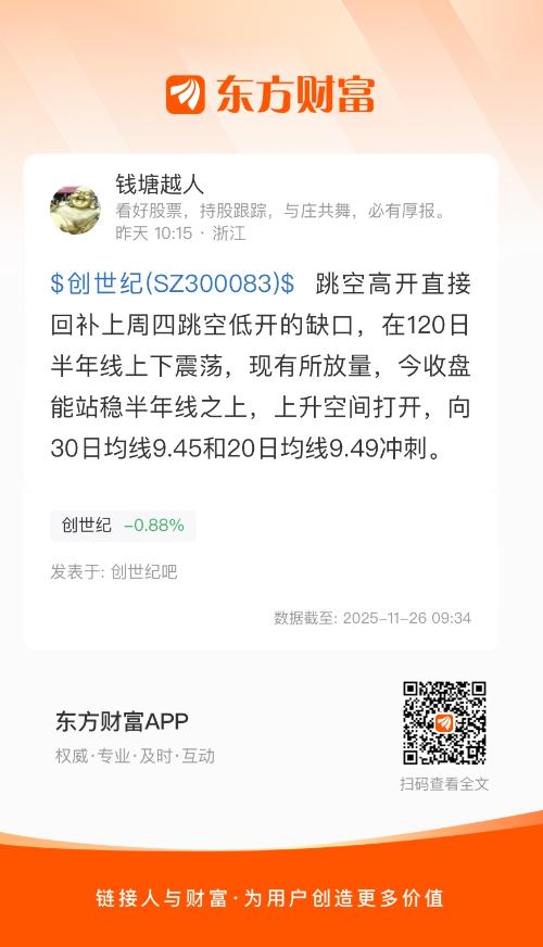 $创世纪(SZ300083)$ 跳空高开直接回补上周四跳空低开的缺口,在120日半年线上下震荡,现有所放量,今收盘能站稳半年线之上,上升空间打开,向30日均线9.45和20日均线9.49冲刺。