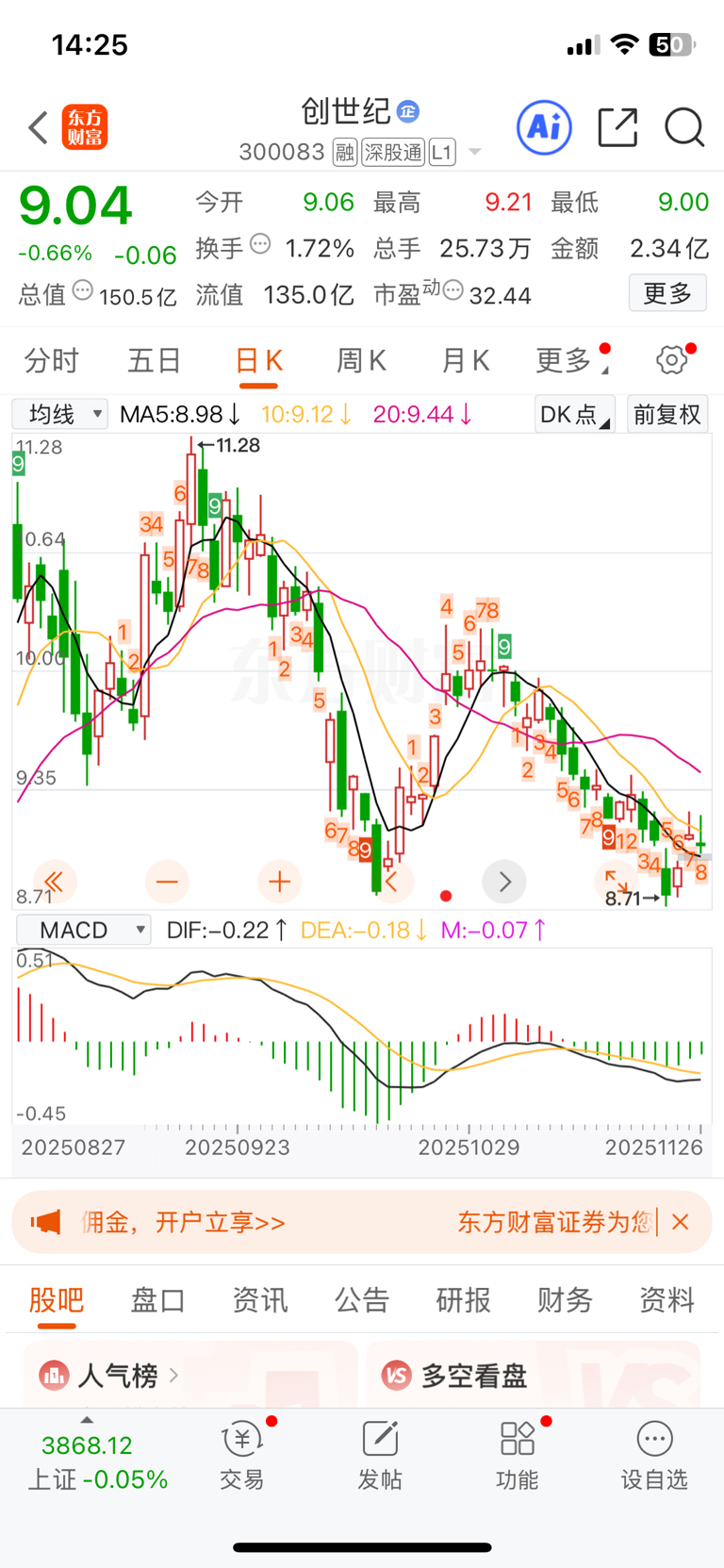 $创世纪(SZ300083)$ M A C D底背离,回到10元上方是必然的,5天均线(8.98元附近低吸。