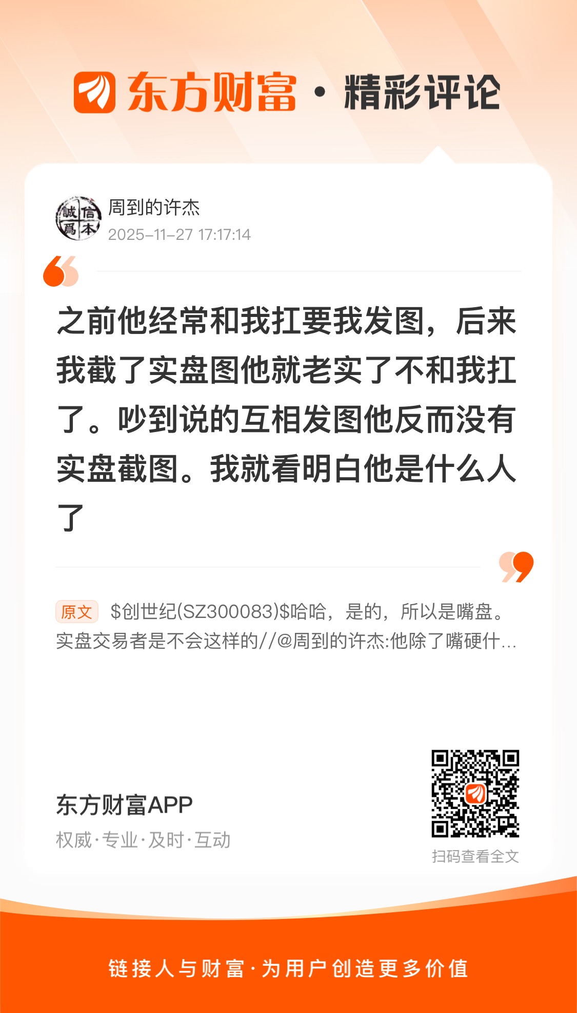 $创世纪(SZ300083)$ 哈哈,是的,所以是嘴盘。实盘交易者是不会这样的//@周到的许杰 : 他除了嘴硬什么都不是,说过的话总找理由圆回来