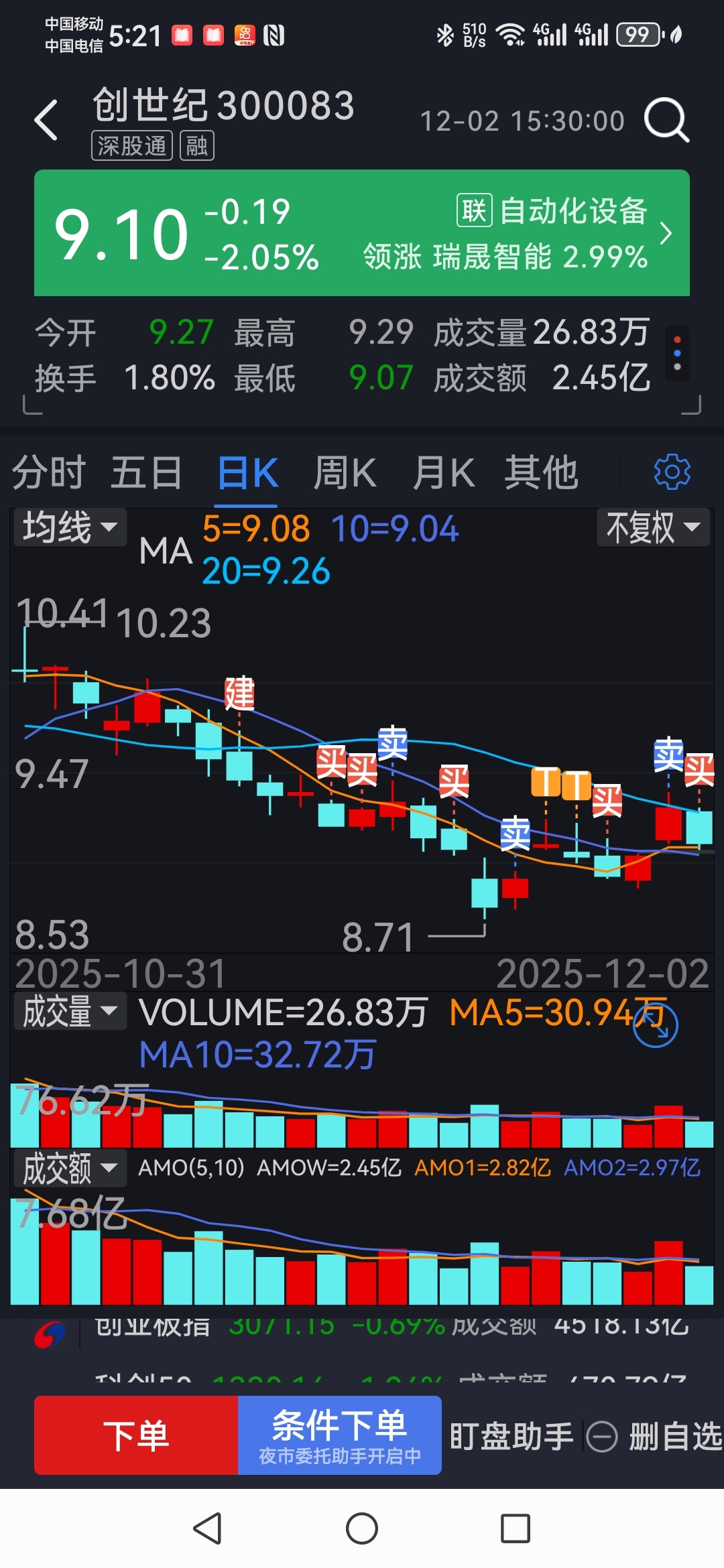 创世纪自调整至今共24个交易日,时间上完成了一个调整周期,空间上基本到位,近日从创世纪日K线图上多次出现买入信号,该动手建仓、加仓了,机不可失,失不再来。