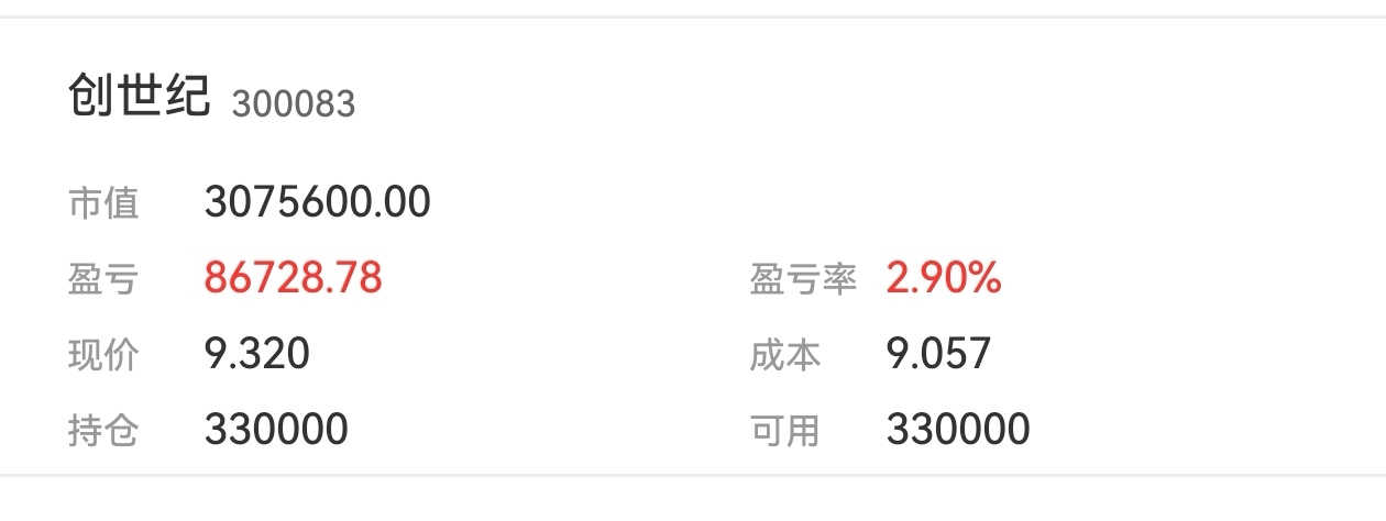 $创世纪(SZ300083)$ 创世纪企业优秀发展趋势良好,盈利能力不错股票价位又低,无论从投资与投机角度来说还是值得入手的,我先下单珍藏三十三万股后面我还会继续加仓
