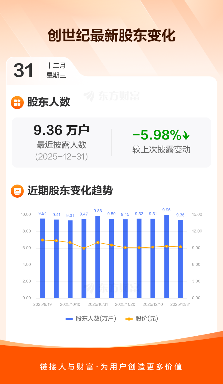 创世纪:截至12月31日最新股东户数9.36万户,较上期减少5.98%