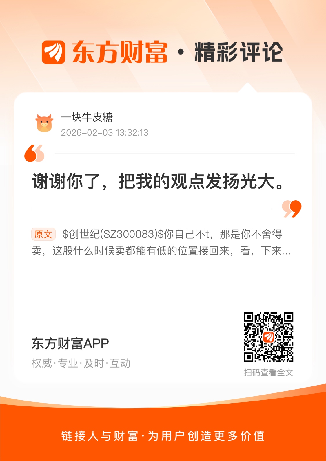 温馨提示: 1.根据《证券法》规定,禁止编造、传播虚假信息或者误导性信息,扰乱证券市场;2.用户在本社区发表的所有资料、言论等仅代表个人观点,与本网站立场无关,不对您构成任何投资建议。用户应基于自己的独立判断,自行决定证券投资并承担相应风险。《东方财富社区管理规定》
