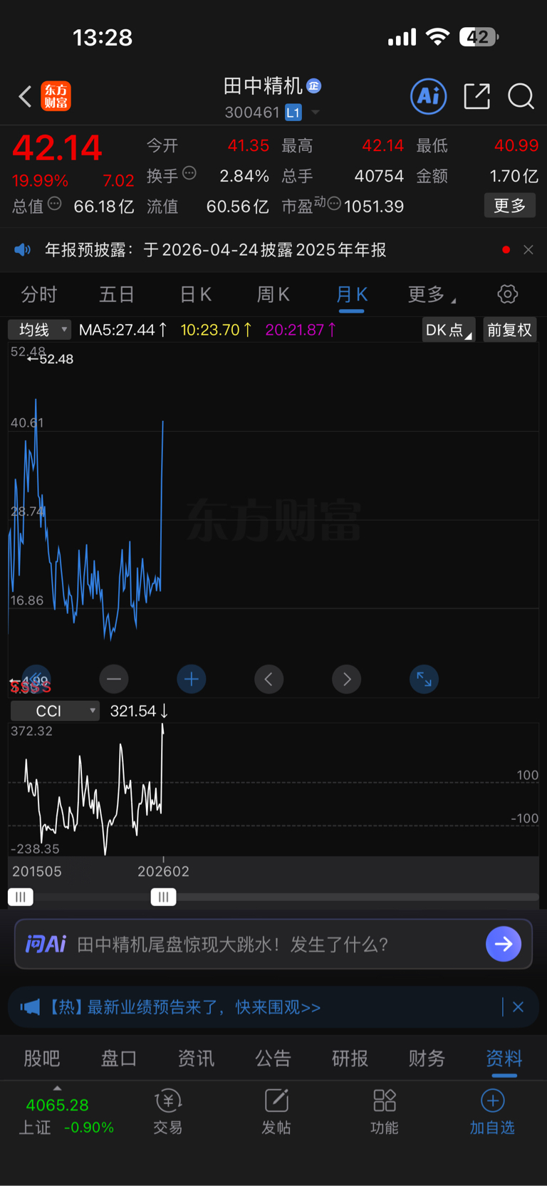 田中精机一个破股42元,怎么能20cm涨停的?快历史新高了