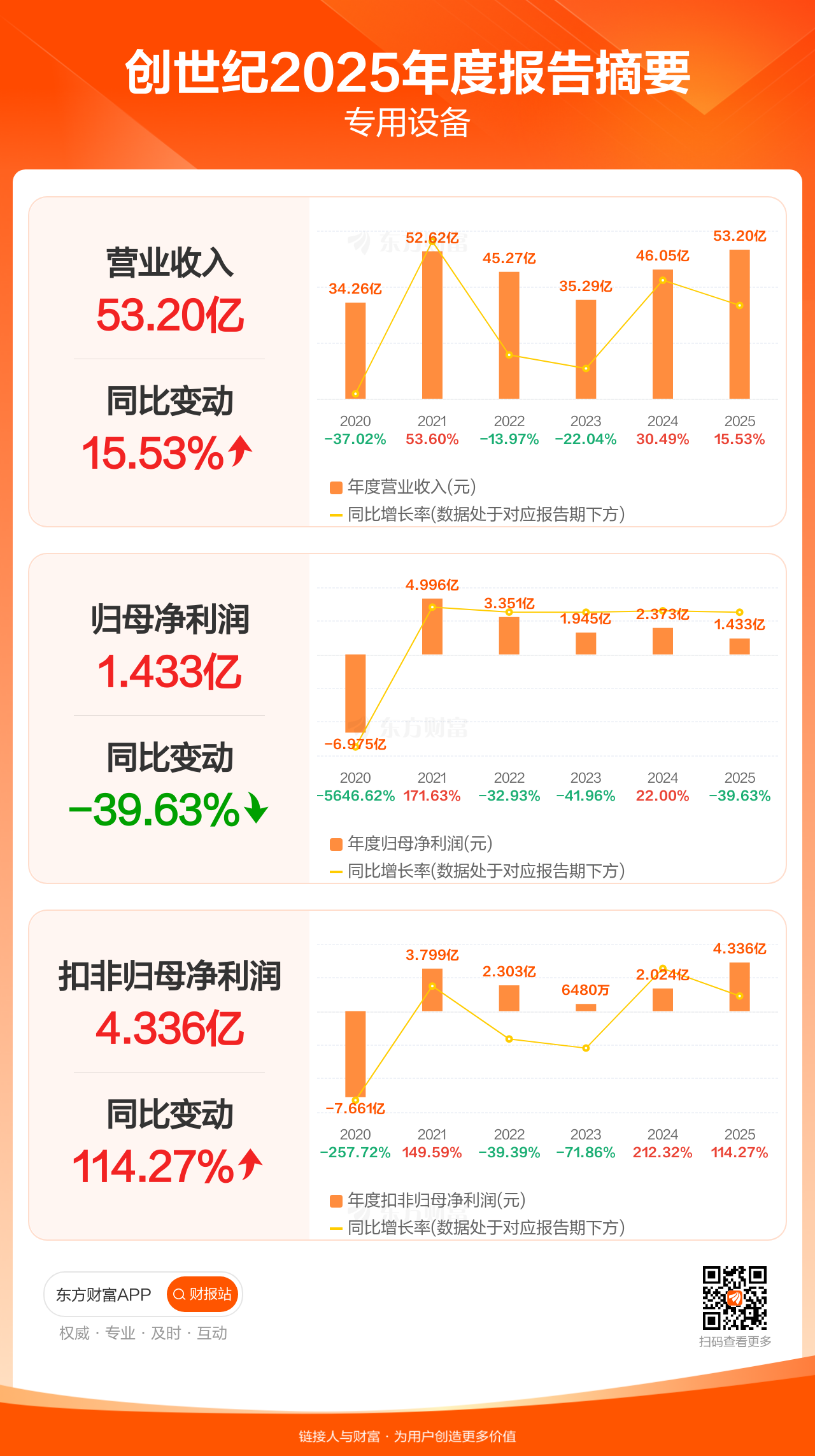 创世纪4月1日发布2025年年报显示,公司全年实现营业收入53.20亿元,同比增长15.53%;归母净利润1.43亿元,同比下滑39.63%;扣非归母净利润4.34亿元,同比增长114.27%。