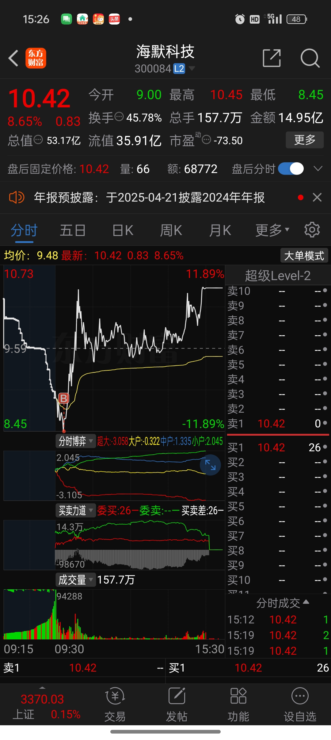 $海默科技(SZ300084)$ 回血了感谢主力
