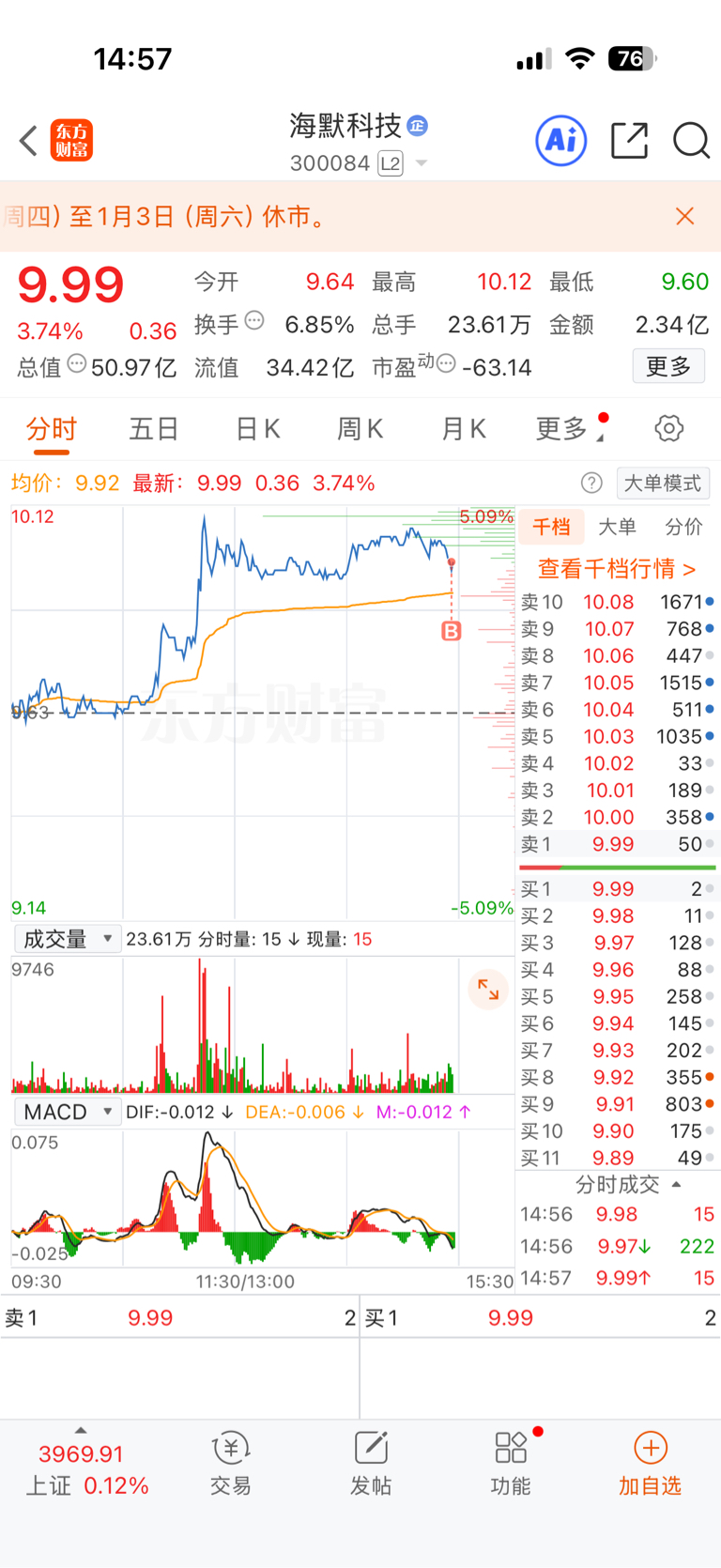 $海默科技(SZ300084)$ 继续尾盘收入。