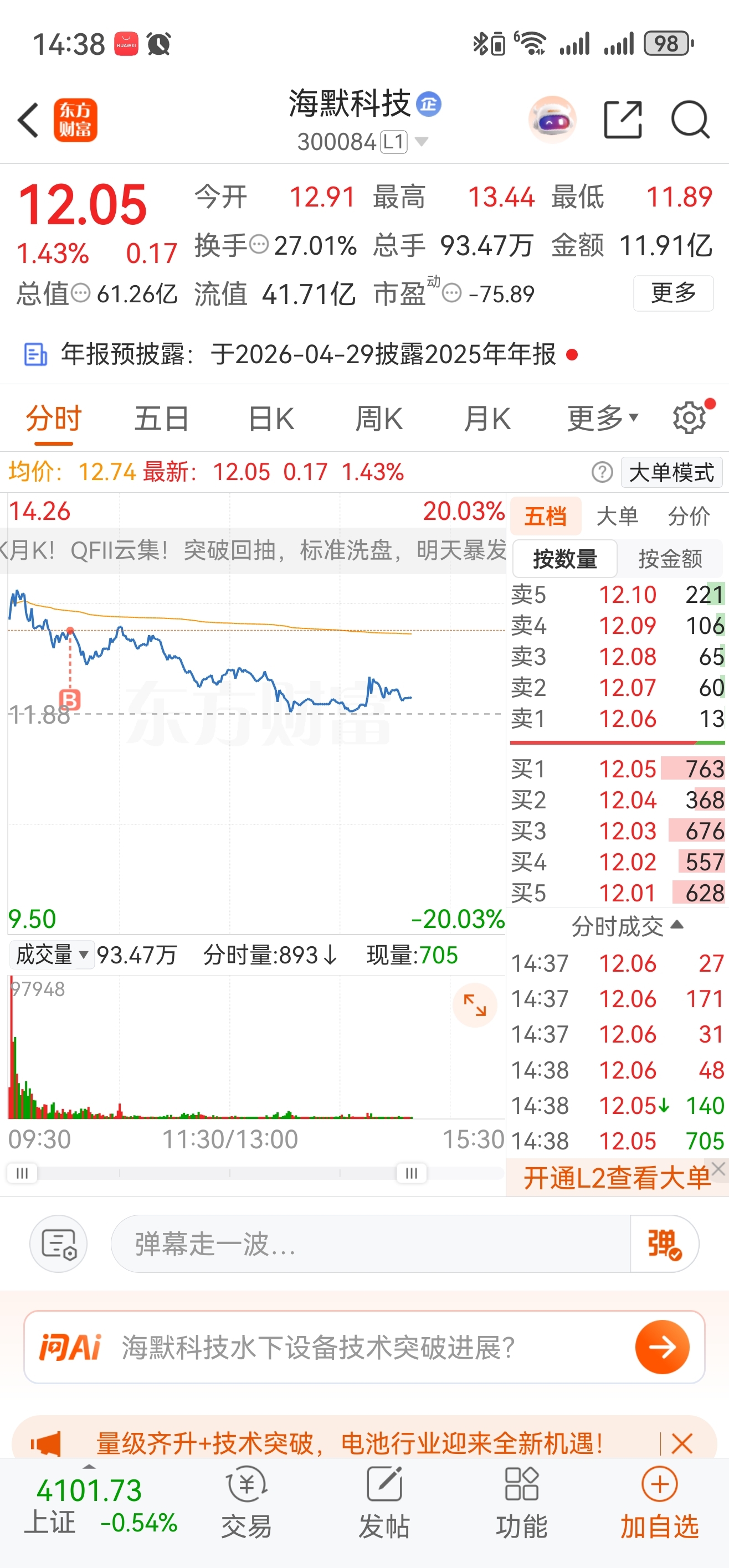 $海默科技(SZ300084)$ 无语了,还顶了半天,买进来的,巨亏
