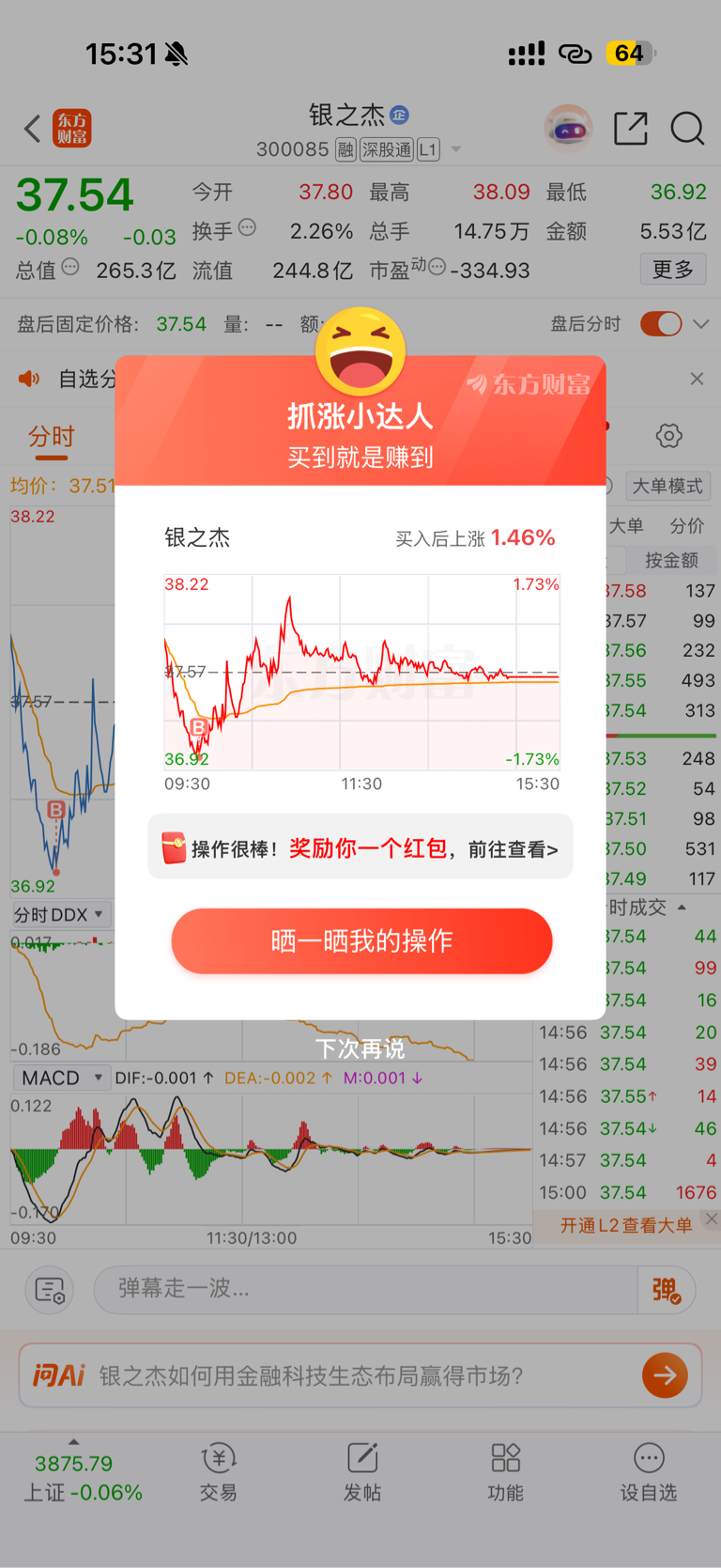 $银之杰(SZ300085)$ 38.5都到不了…继续跟你拼了