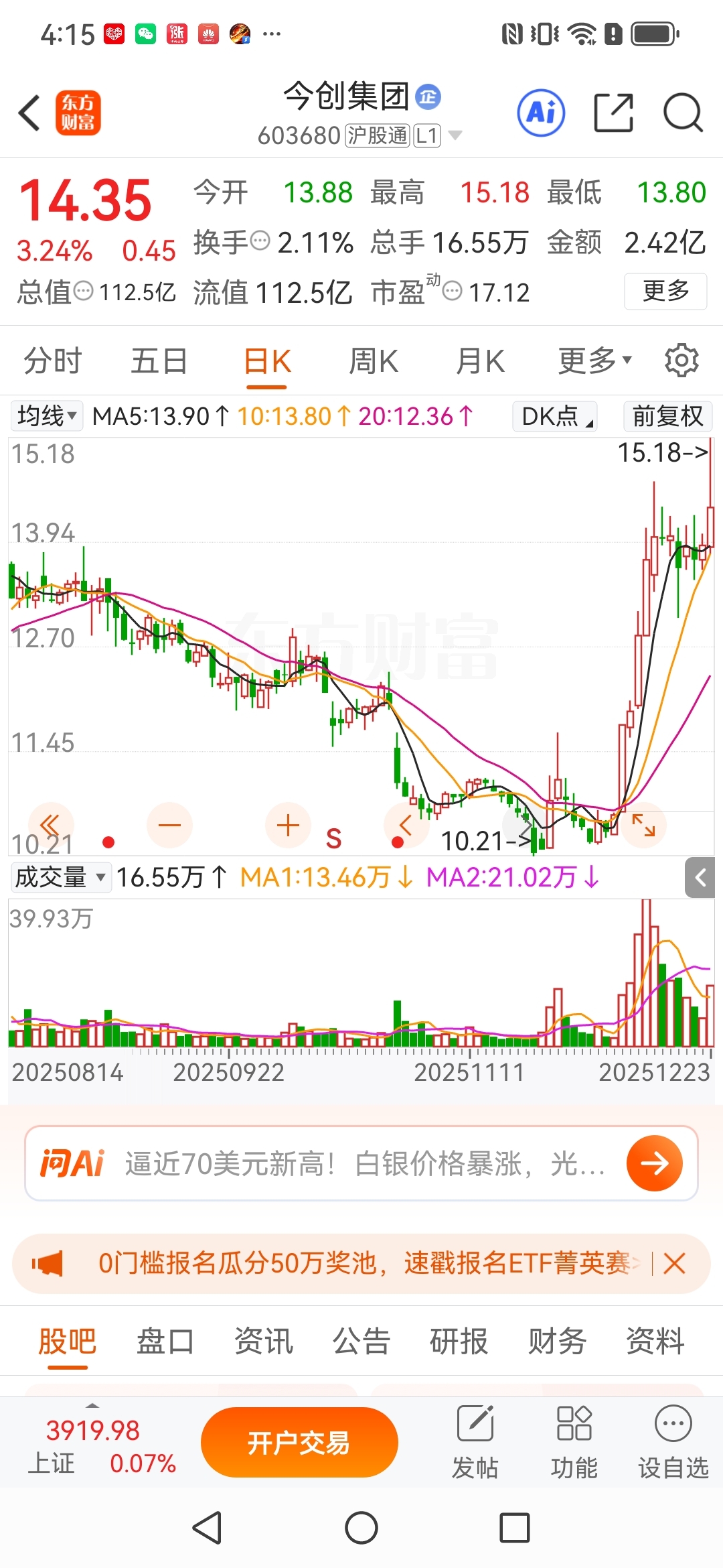 我以前从来不敢买连续多年亏损股,因为它不知道什么时候就会暴雷被ST。直到上个礼拜一我看到这个股和今创集团走势十分相似,最关键的是它也是底部拉升之后开始缩量回调,今创集团是回调之后连续放量拉升,已经底部反弹了四成,我就想投机一把……