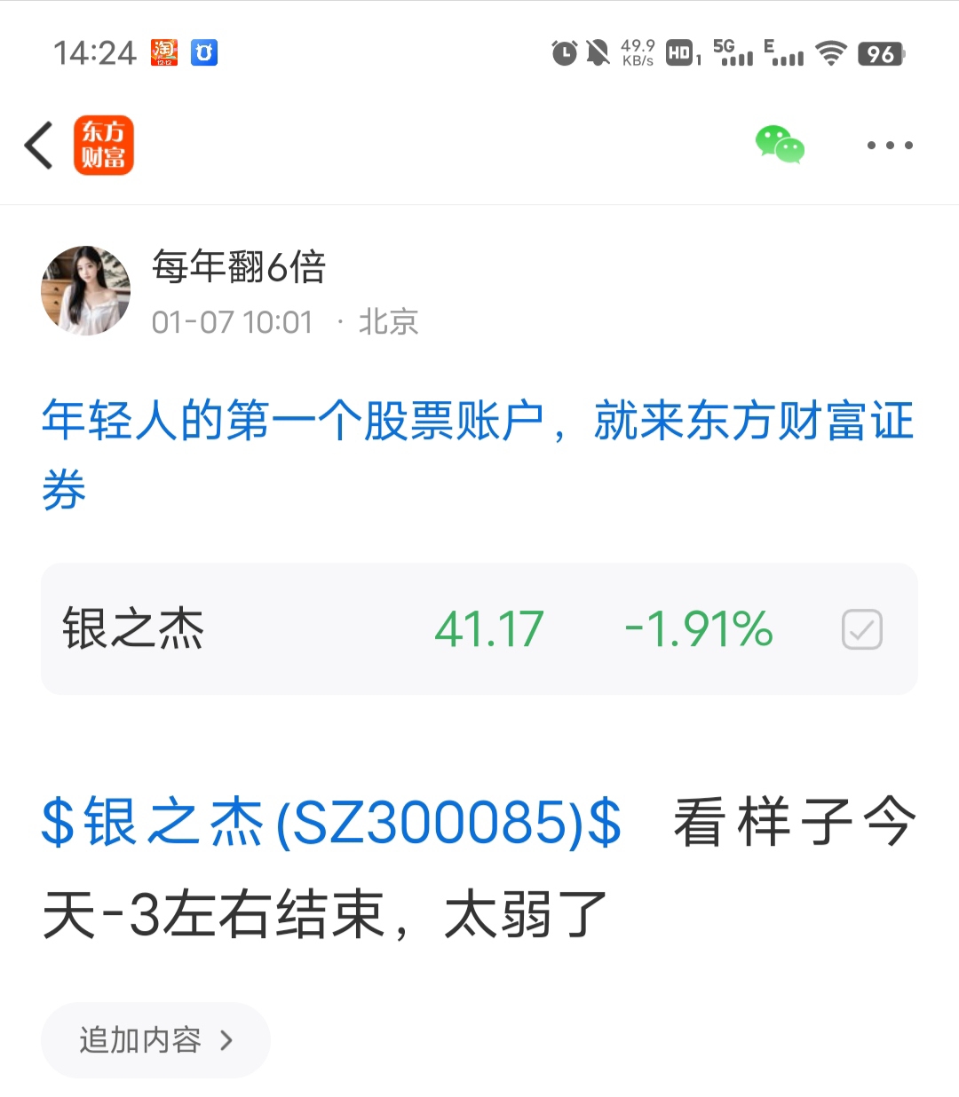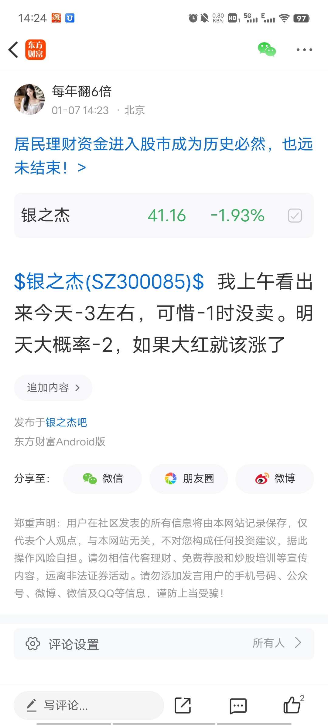 温馨提示: 1.根据《证券法》规定,禁止编造、传播虚假信息或者误导性信息,扰乱证券市场;2.用户在本社区发表的所有资料、言论等仅代表个人观点,与本网站立场无关,不对您构成任何投资建议。用户应基于自己的独立判断,自行决定证券投资并承担相应风险。《东方财富社区管理规定》