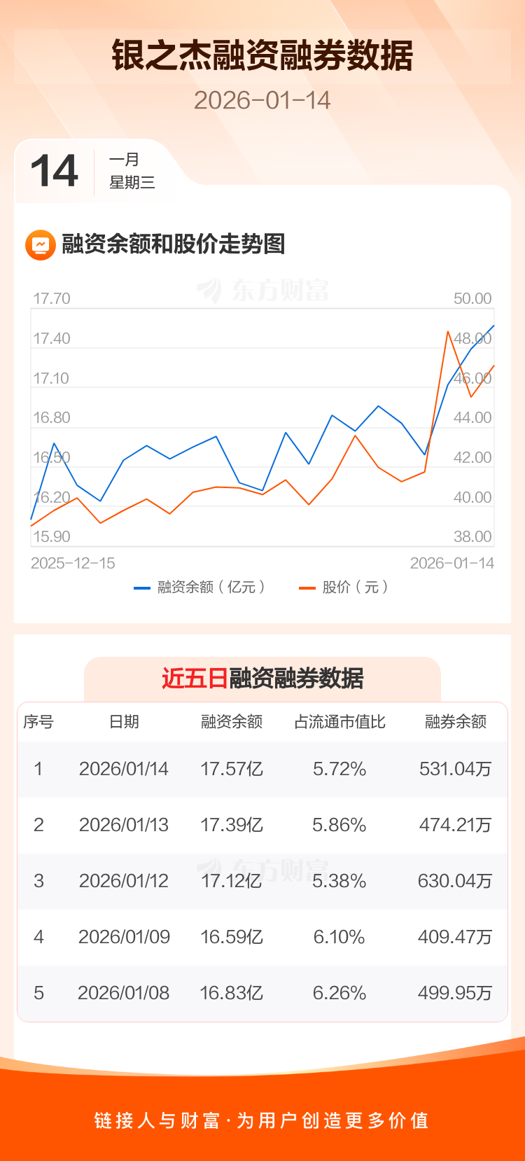 交易所最新数据显示,银之杰于2026年1月14日获融资买入5.43亿元,融资偿还5.25亿元,当日融资净买入1816.12万元。目前,该股融资余额17.57亿,占流通市值比例为5.72%。