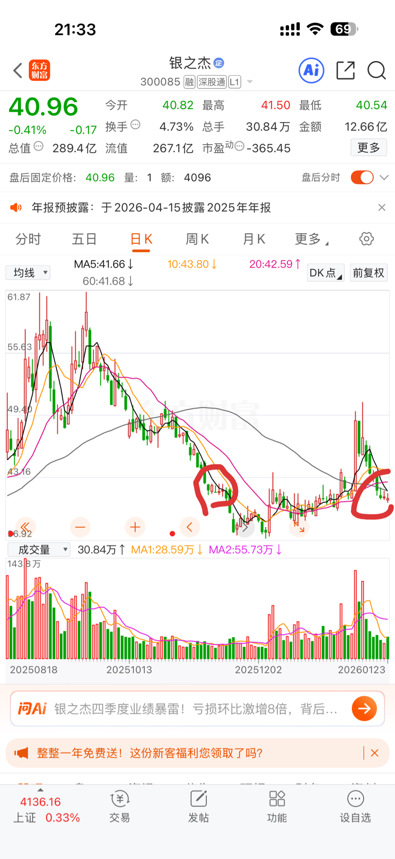 $银之杰(SZ300085)$ 昨天唱多的人今天闭嘴了吧?我一直都提示这股全是散户,业绩非常差,接下来很有可能会跌破前期低点的。估计去到30才会止跌盘整,那些不是傻就是托的唱多者,你们只会被打脸。不信就等着瞧,也不一定是叫打脸,有可能是他的工作诱导散户接盘的。感觉下图走得很像!