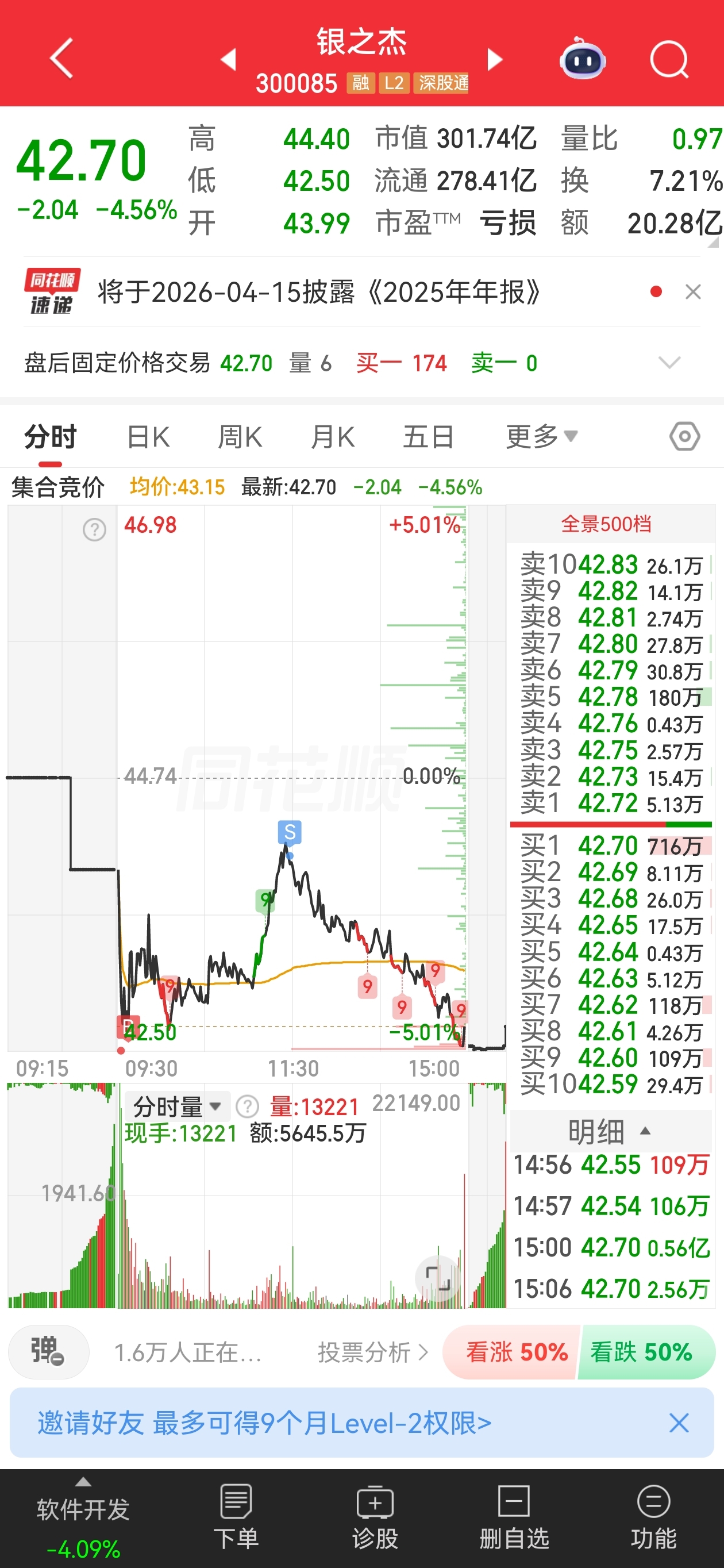 $银之杰(SZ300085)$ 可惜的是,破了5日均线