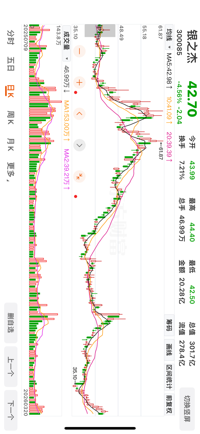 $银之杰(SZ300085)$ 左侧逼出绝望盘之后转为右侧,右侧成功吸引巨量追涨盘之后再将其套牢,调整已经开始,40元以上不接飞刀,40元以下也不能接太多,不见绝望盘不重仓。银之杰主力控盘能力还是有的,控盘不是为了大涨,而是大起大落,来回割韭菜。如果不想亏钱,先学会它的一二一二一的节奏。