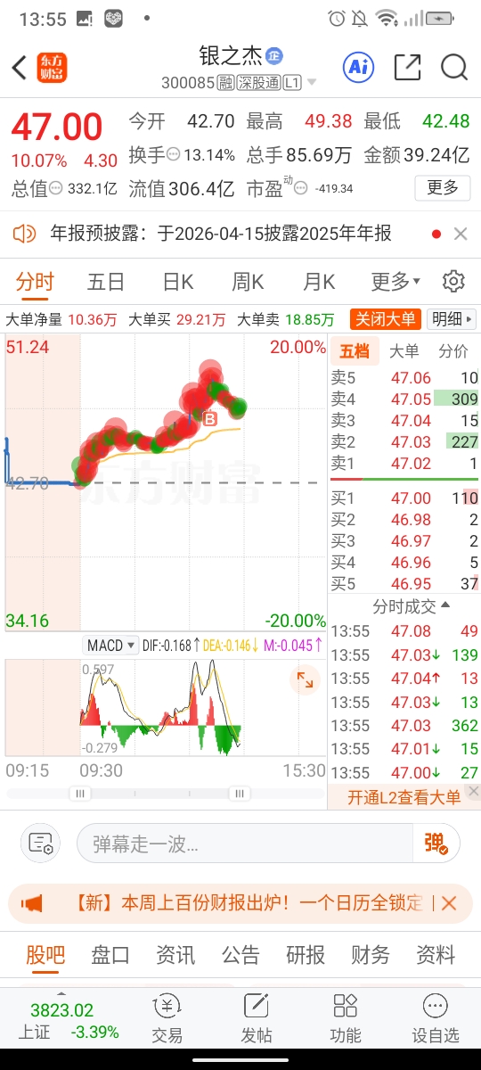 $银之杰(SZ300085)$ 哈哈也买高啊?耐心等待分时图红柱补仓啊?感谢神。