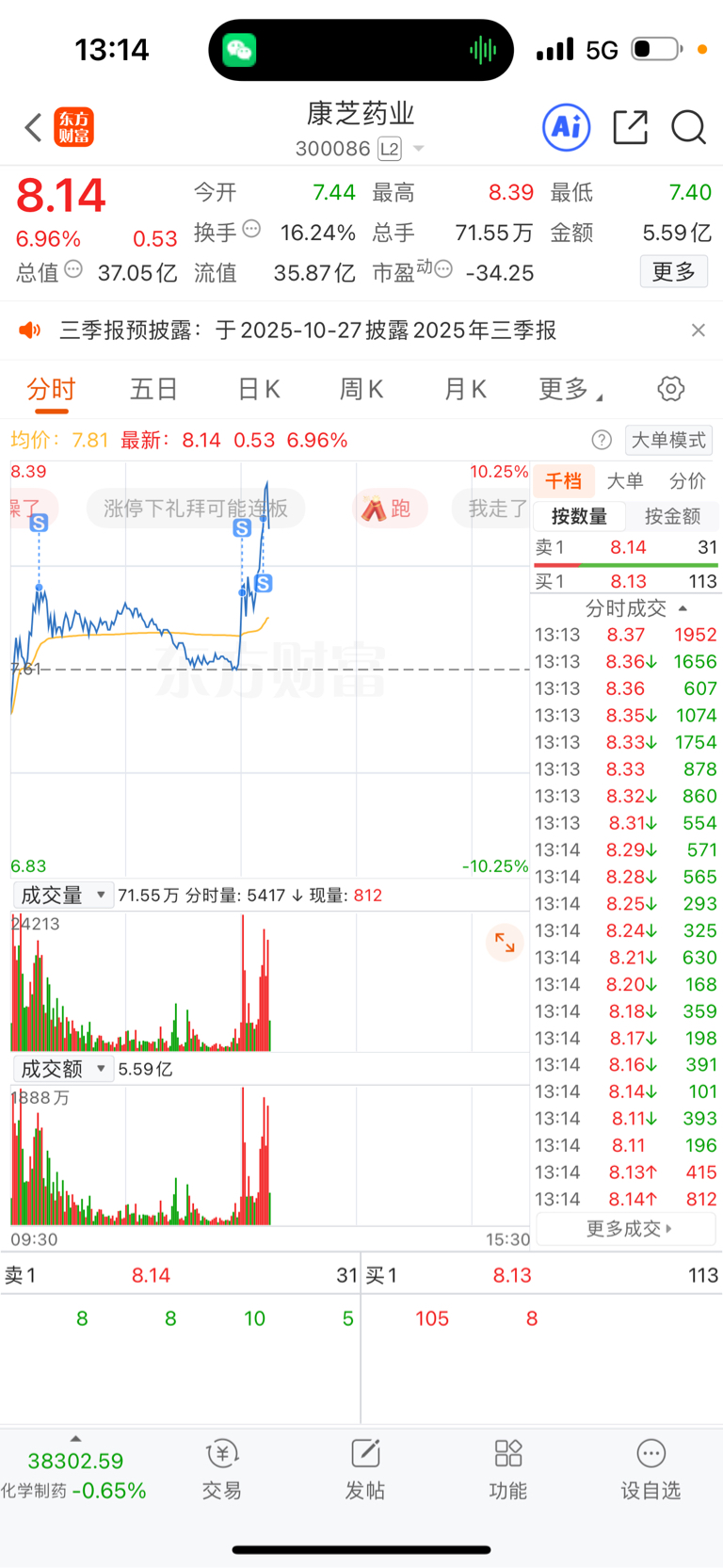$康芝药业(SZ300086)$ 周一不回调我直播多