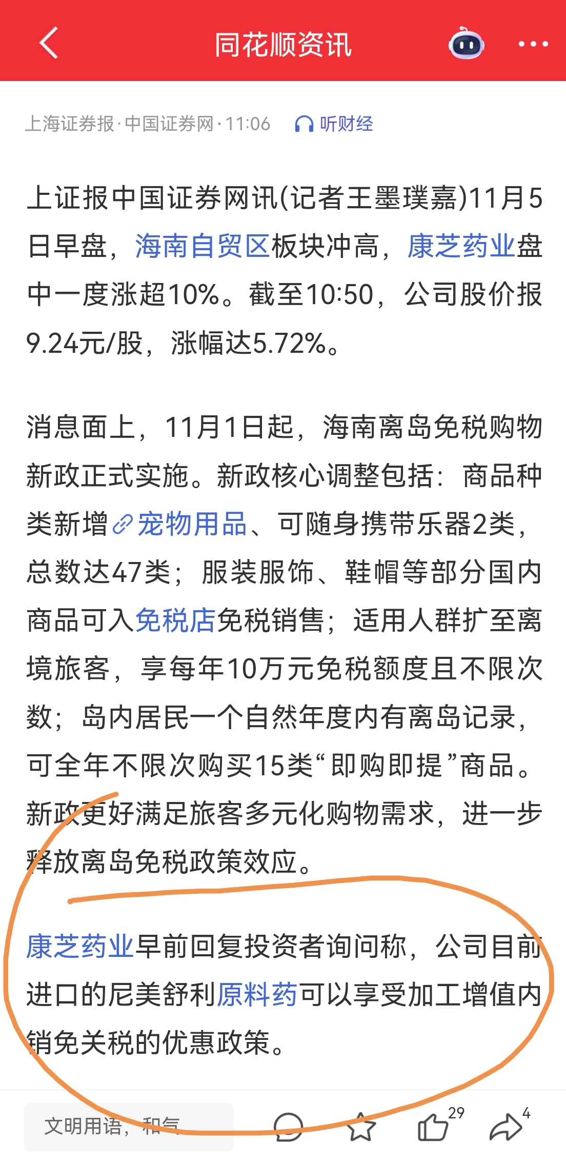 $康芝药业(SZ300086)$ 康芝药业应该是目前海南自贸区板块,首个实锤官宣免关税的上市公司吧,这段时间换手也够了,关键股价还没怎么涨,股权转让也已经完成,静待资金引爆