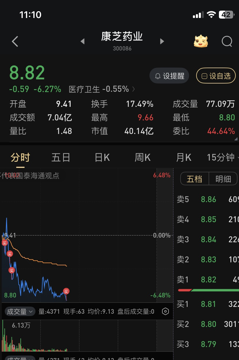 $康芝药业(SZ300086)$ 韭菜之常规操作,越跌越买