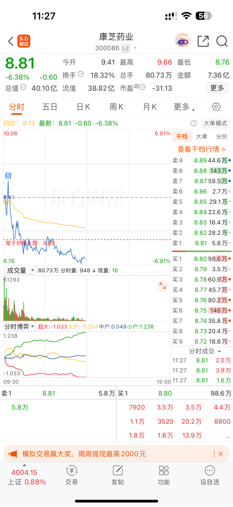 $康芝药业(SZ300086)$ 昨天入的小赚四个点,今早红盘出完了,昨天看那个走势感觉今天就完了,还好跑得快