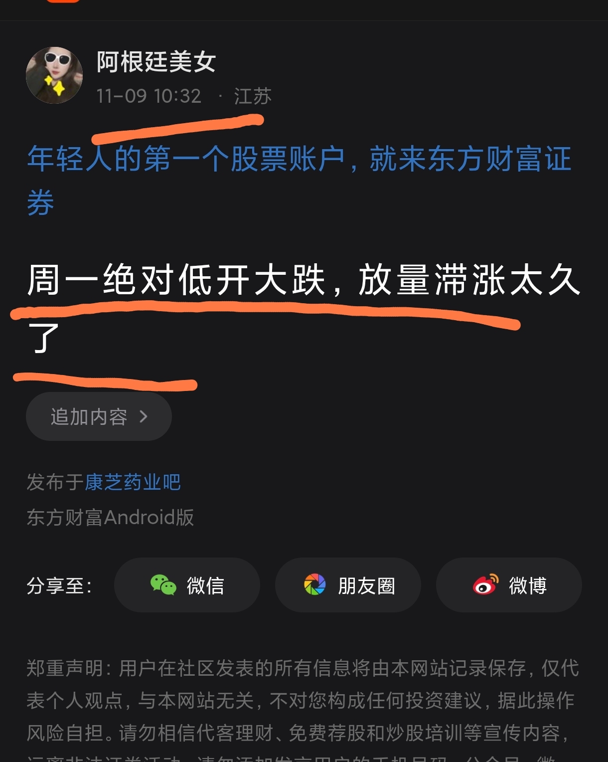温馨提示: 1.根据《证券法》规定,禁止编造、传播虚假信息或者误导性信息,扰乱证券市场;2.用户在本社区发表的所有资料、言论等仅代表个人观点,与本网站立场无关,不对您构成任何投资建议。用户应基于自己的独立判断,自行决定证券投资并承担相应风险。《东方财富社区管理规定》