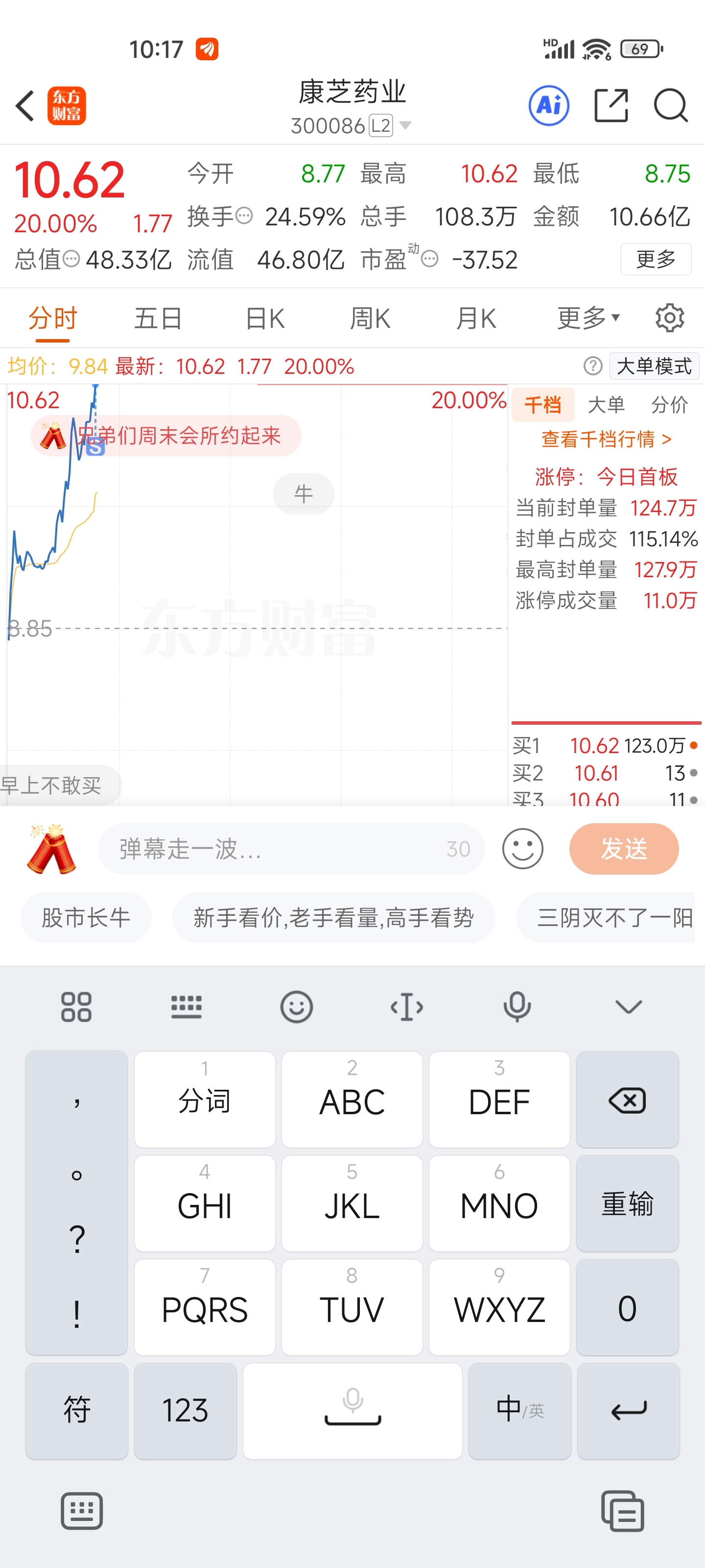 $康芝药业(SZ300086)$ 这周做了两次,今天涨停价走了,留下的发财