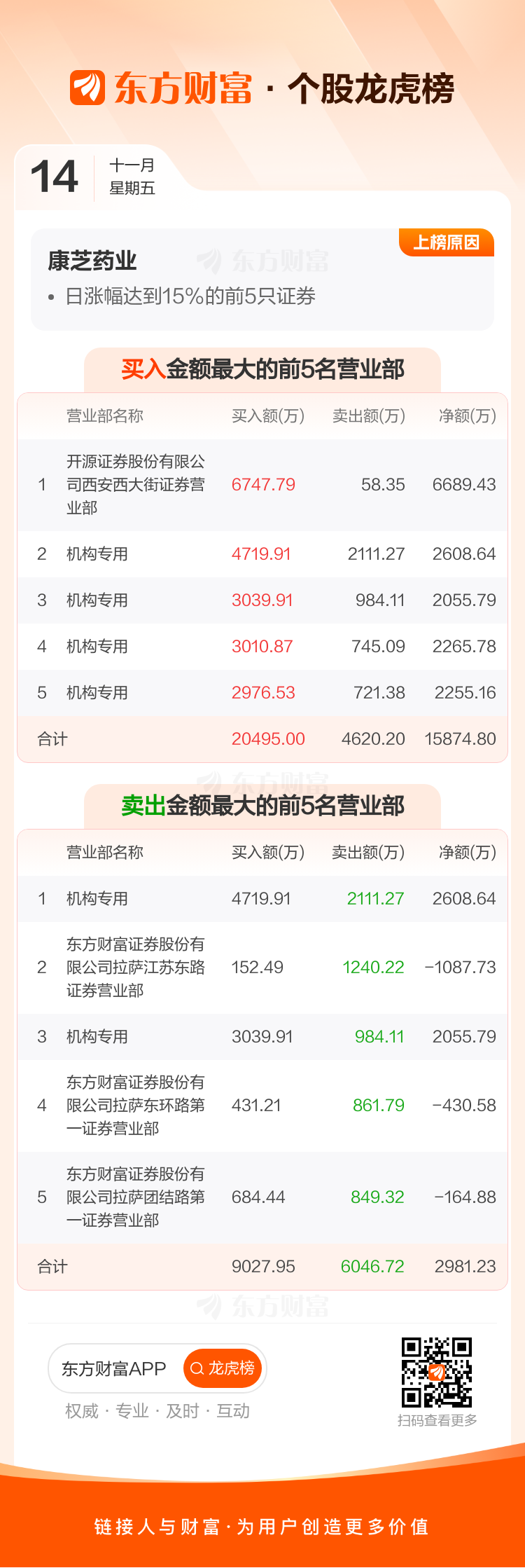 交易所2025年11月14日公布的交易公开信息显示,康芝药业因成为日涨幅达到15%的前5只证券上榜。康芝药业当日收报10.62元,涨跌幅20.00%,偏离值20.00%,换手率28.34%,成交额12.42亿。