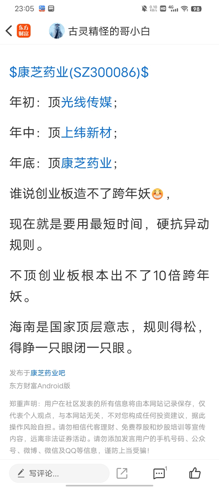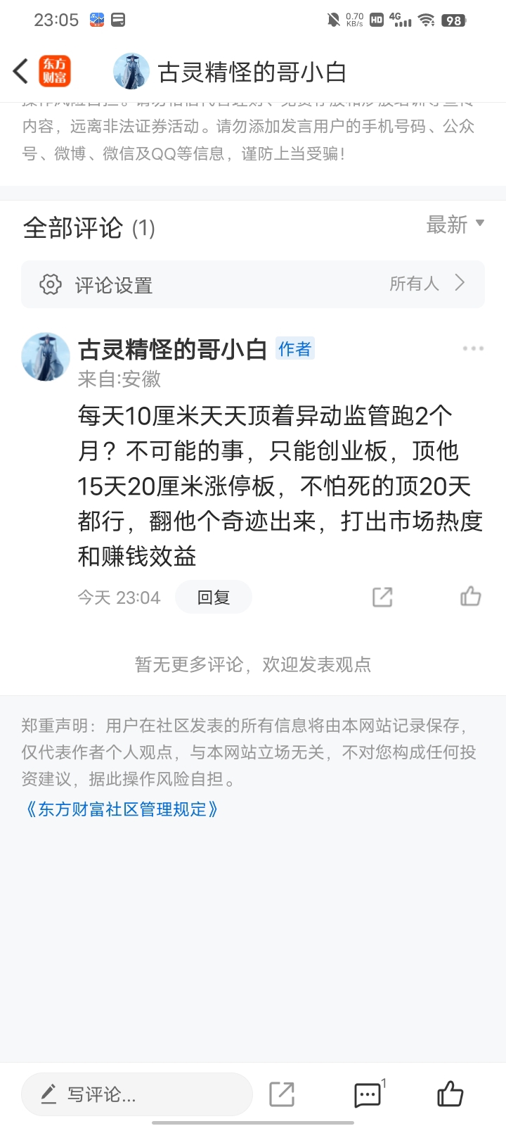 温馨提示: 1.根据《证券法》规定,禁止编造、传播虚假信息或者误导性信息,扰乱证券市场;2.用户在本社区发表的所有资料、言论等仅代表个人观点,与本网站立场无关,不对您构成任何投资建议。用户应基于自己的独立判断,自行决定证券投资并承担相应风险。《东方财富社区管理规定》