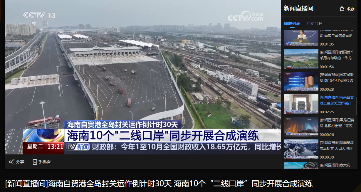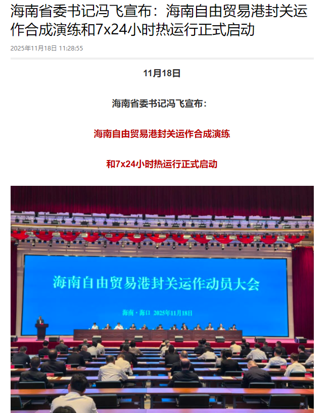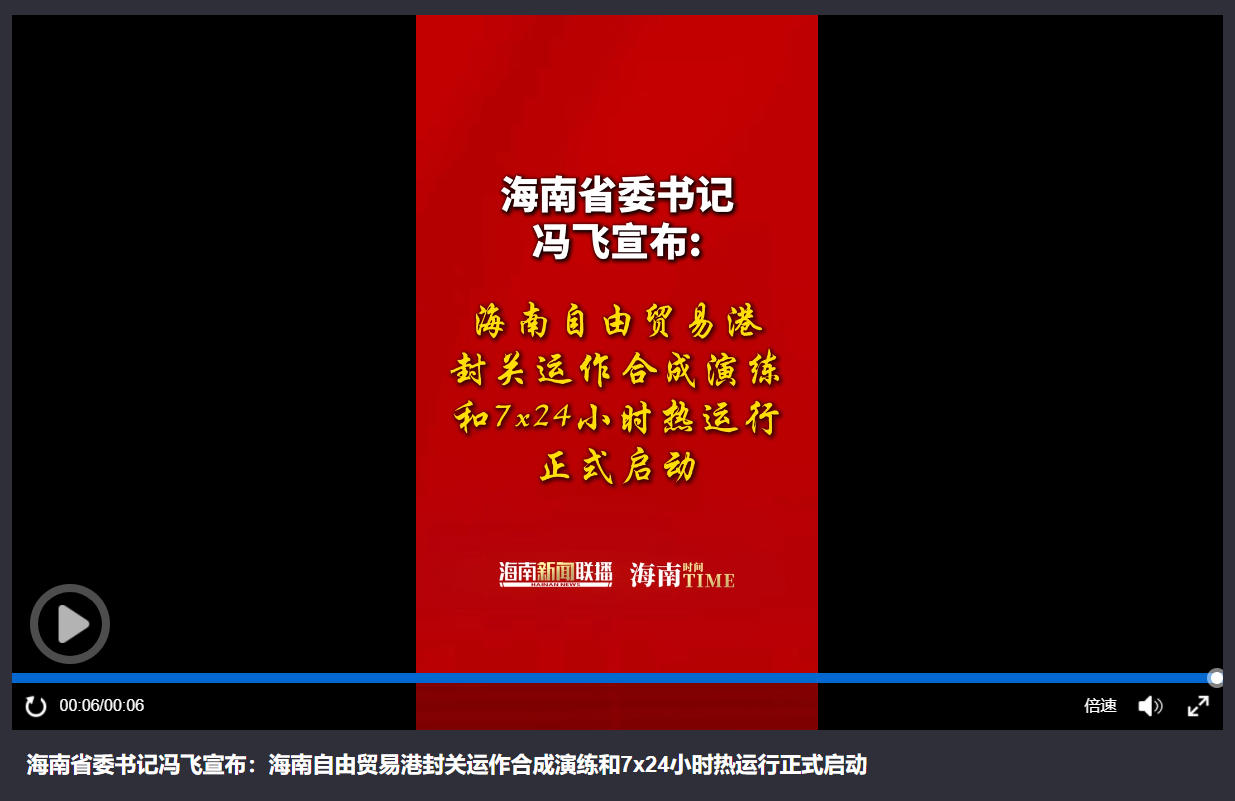 海南省委书记今日宣布:海南自由贸易港封关运作合成演练和7x24小时热运行正式启动