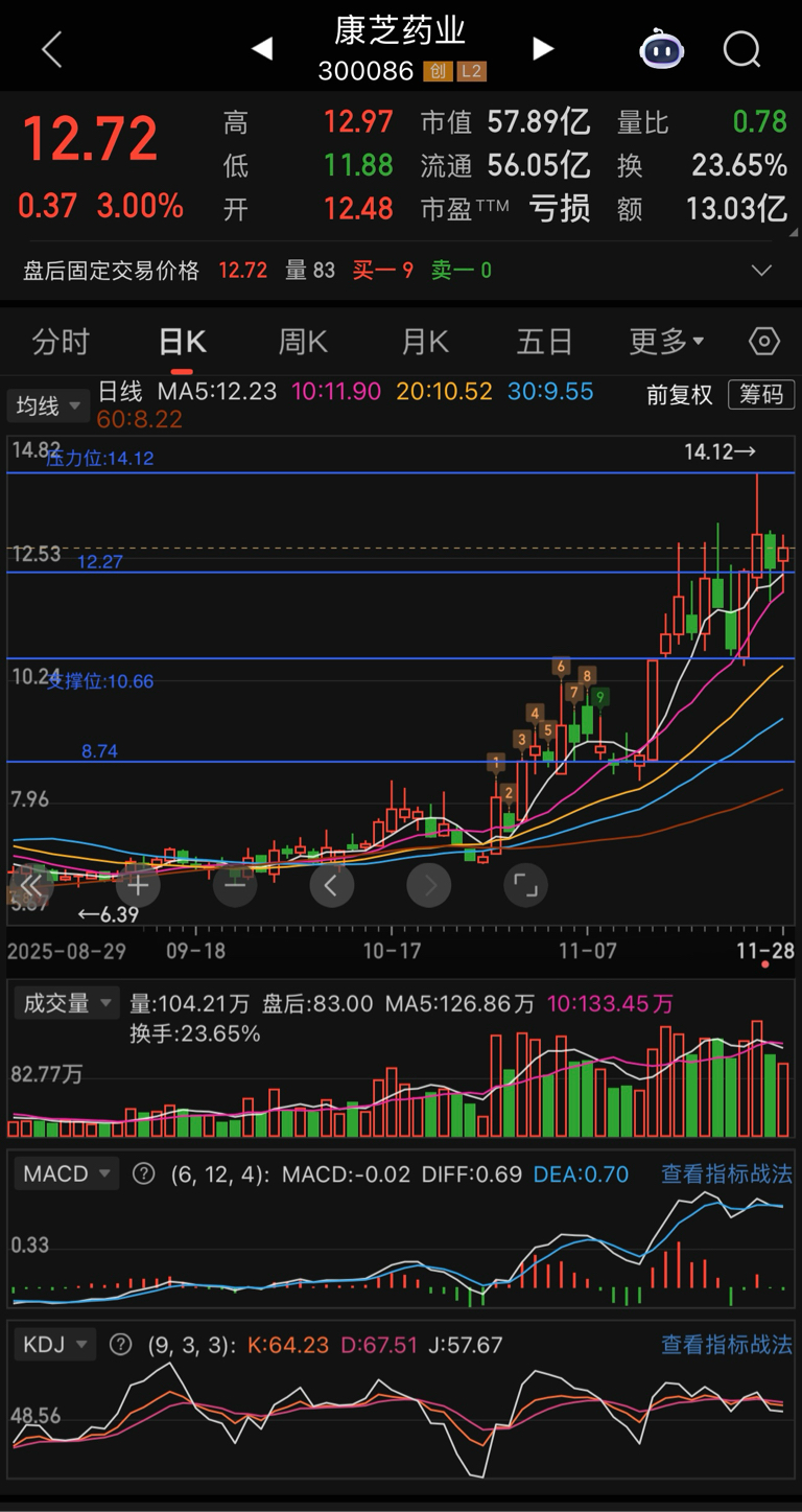 $康芝药业(SZ300086)$ 每一次启动的点都是在上次大涨的最高点