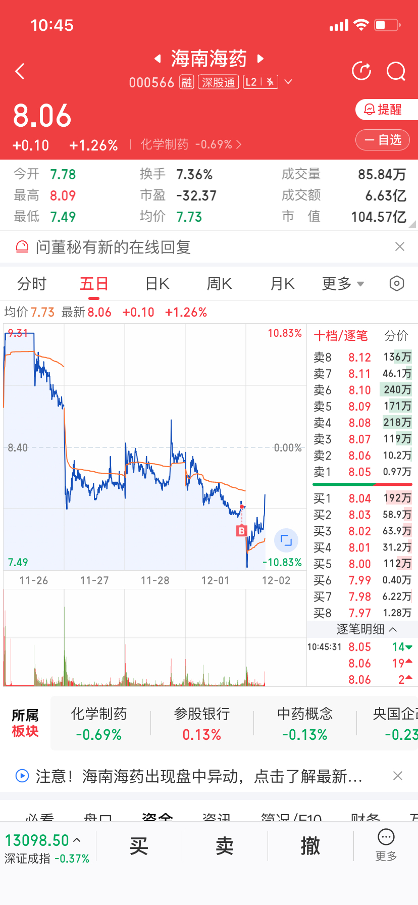 $康芝药业(SZ300086)$ 跟屁虫。海药不涨停。别想涨